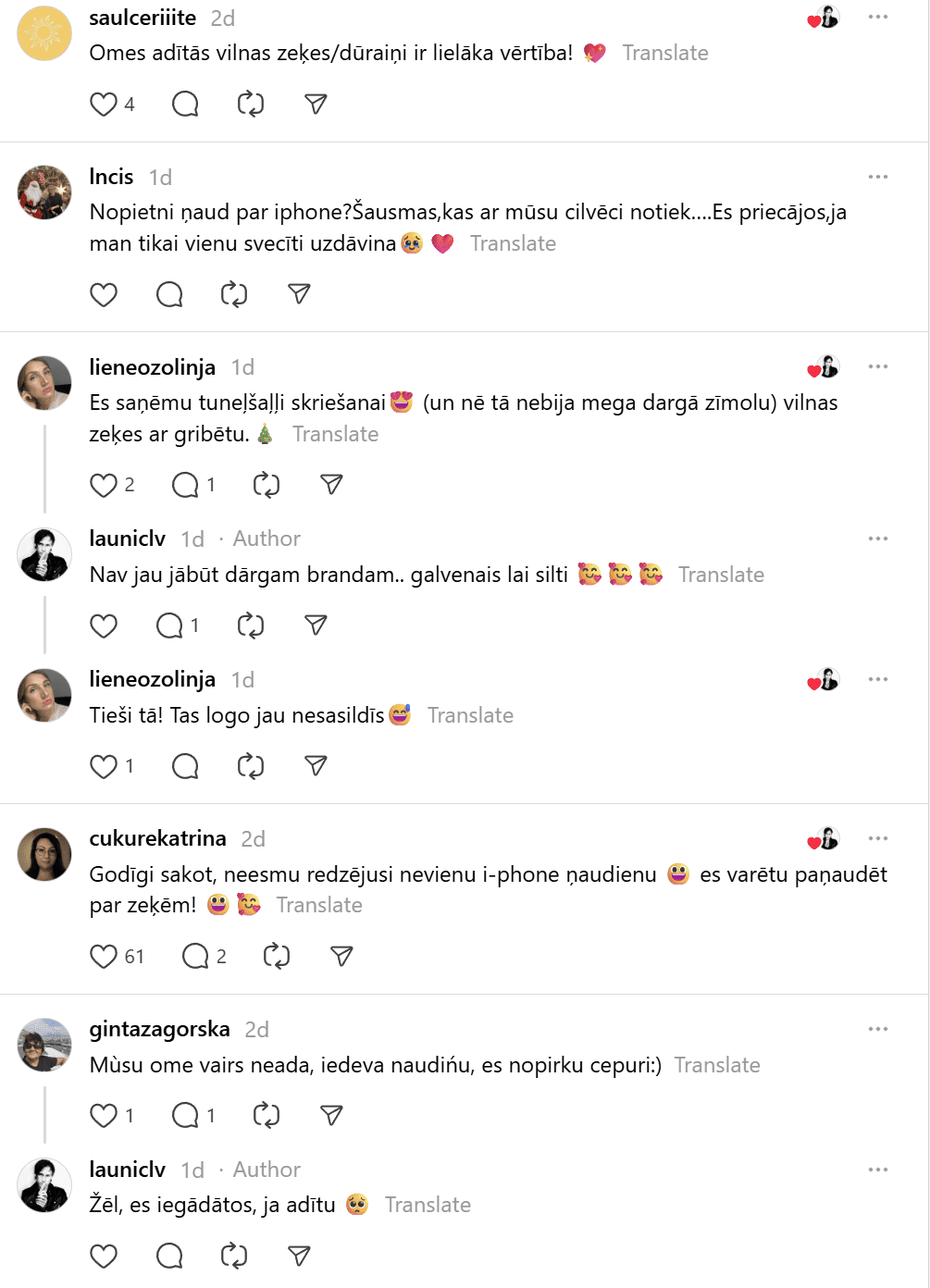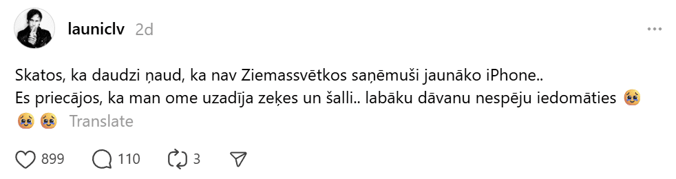 “Skatos, ka daudzi ņaud, ka nav Ziemassvētkos saņēmuši jaunāko iPhone… Es priecājos, ka man ome uzadīja zeķes un šalli… labāku dāvanu nespēju iedomāties,” raksta soctīkla lietotājs.