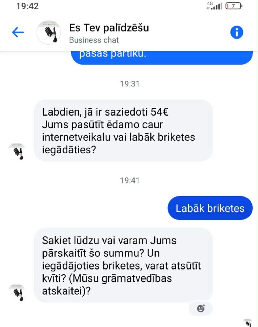 Taču šī nav vienīgā sūdzība par konkrēto labdarības organizāciju. Kāda cita sieviete norāda, ka lūgusi palīdzību ar pārtikas un higiēnas precēm. Arī viņas vārds tika izmantots līdzīgā “Facebook” ierakstā, lūdzot pēc palīdzības, un cilvēki komentēja, ka ir ziedojuši. Tomēr beigās sieviete saņēma vien nelielu pārtikas paku, tādu, kādu prasti izsniedz trūcīgajiem.