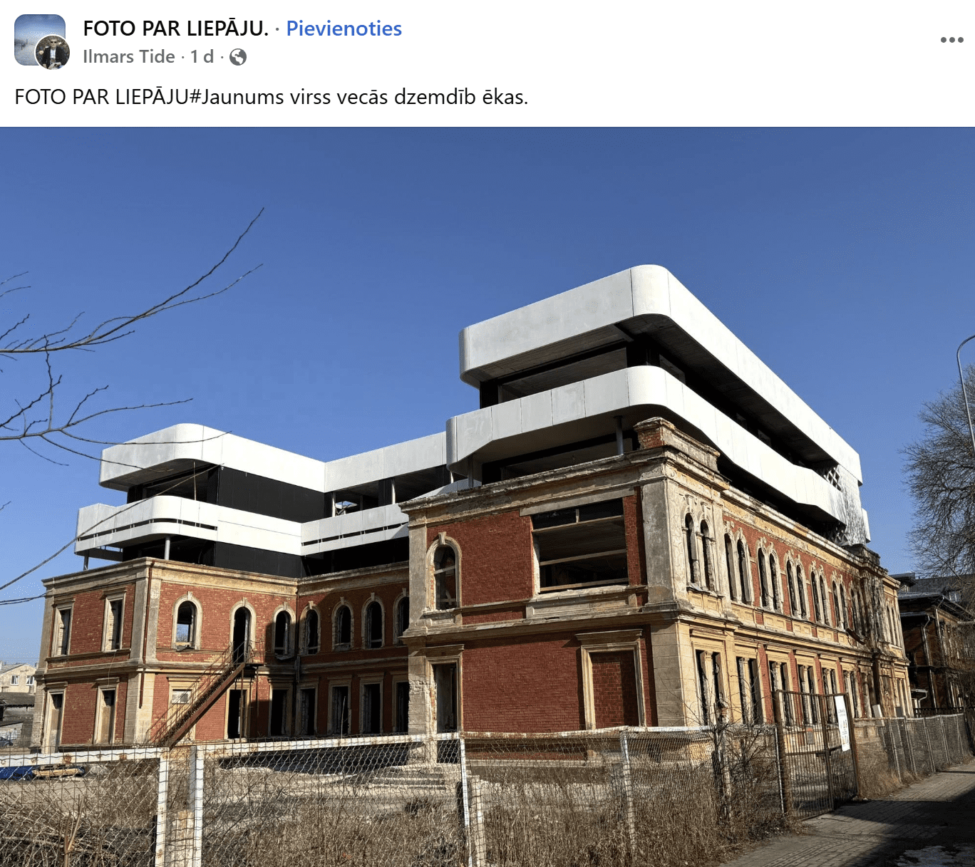 Ar šādu ēkas fotogrāfiju vietējās kopienas “Facebook” grupā “Foto par Liepāju” dalījies Ilmārs. Fotogrāfijā redzama veca ēka ar moderniem jauninājumiem. Spriežot pēc komentāriem, lielākajai daļai ļaužu šāds arhitektūras risinājums nešķiet pieņemams.