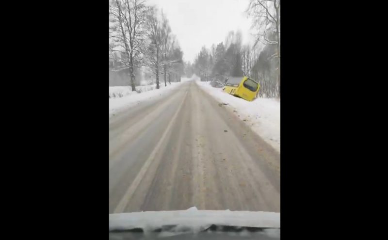 Sociālajos medijos ievietotais video liecina, ka autobuss atrodas grāvī un ir nedaudz sagāzies slīpi.