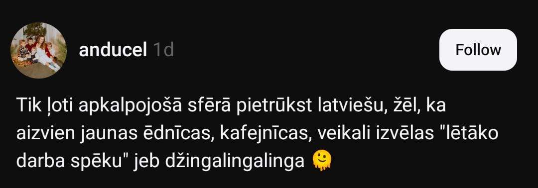 Anda sociālo mediju platformā “Threads” raksta: “Tik ļoti apkalpojošā sfērā pietrūkst latviešu, žēl, ka aizvien jaunas ēdnīcas, kafejnīcas, veikali izvēlas “lētāko darba spēku” jeb džingalingalinga.”