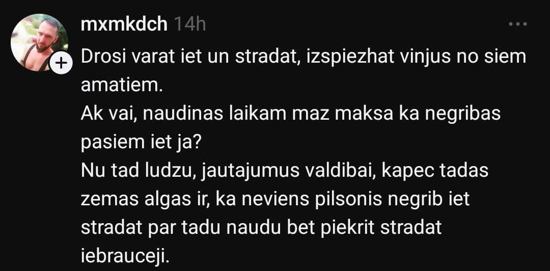 Līgas paustais viedoklis skan skarbi: “Ja latvieši nebūtu tik izlepuši ar darbu, tad darba devēji nepieņemtu ārzemniekus darbā! Viņiem galvenais, lai ir kas strādā!