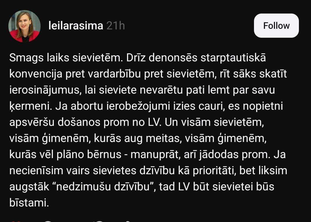 Leila sociālo mediju platformā “Threads” raksta: “Smags laiks sievietēm. Drīz denonsēs starptautiskā konvencija pret vardarbību pret sievietēm, rīt sāks skatīt ierosinājumus, lai sieviete nevarētu pati lemt par savu ķermeni. Ja abortu ierobežojumi izies cauri, es nopietni apsvēršu došanos prom no LV. Un visām sievietēm, visām ģimenēm, kurās aug meitas, visām ģimenēm, kurās vēl plāno bērnus – manuprāt, arī jādodas prom. Ja necienīsim vairs sievietes dzīvību kā prioritāti, bet liksim augstāk “nedzimušu dzīvību”, tad Latvijā būt sievietei būs bīstami.”