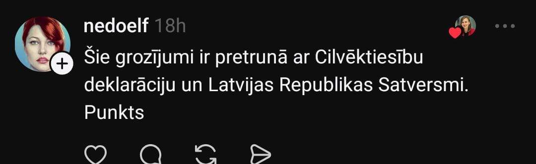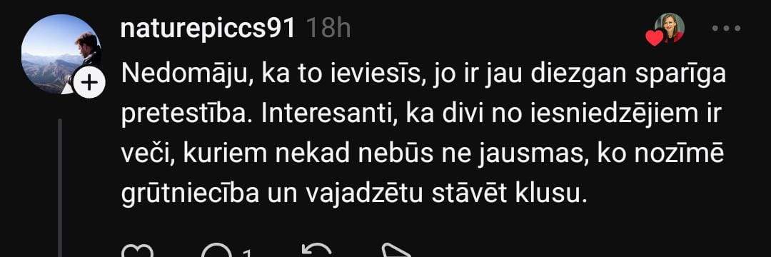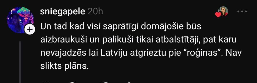 Vēl kāda lietotāja ir gatava doties prom no Latvijas: “Lai gan, runājot par Krievijas iebrukuma draudiem, vienmēr teicu, ka nebēgšu, palikšu šeit un palīdzēšu kā varēšu — cīnīšos informācijas karā, taisīšu sviestmaizes un molotova kokteiļus. Pēdējos mēnešos nākusi smaga apziņa, ka ja valsts nav gatava aizsargāt mani, tad arī es par to negribu krist un cīnīties. Apsveru braukt prom, ja šis likums tiks pieņemts. Acīmredzot, valdībai svarīgāka par tautu ir ideoloģijas un tās nav vērtības par ko iestāties.”