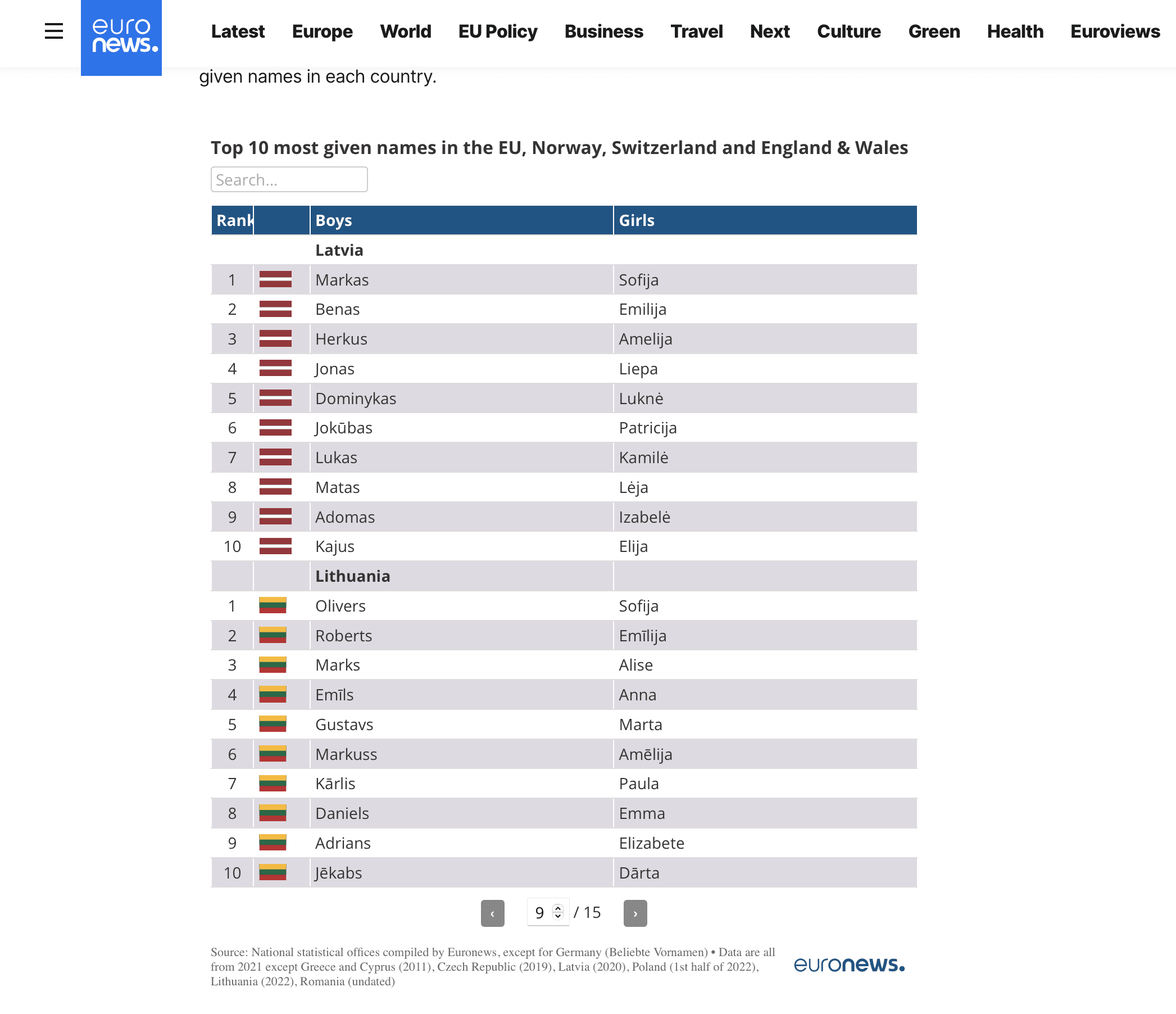 “Euronews” tabulā, kurā dati ņemti no 2020. gada (Latvijā) un 2022. gada (Lietuvā), bet portālā publicēti 2023. gadā, redzams, ka Latvijā populārākie zēnu vārdi ir: