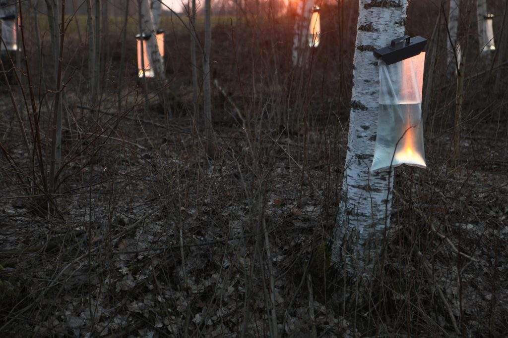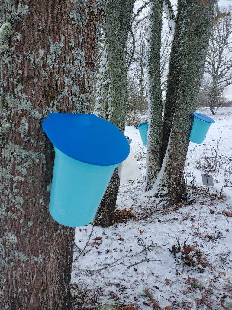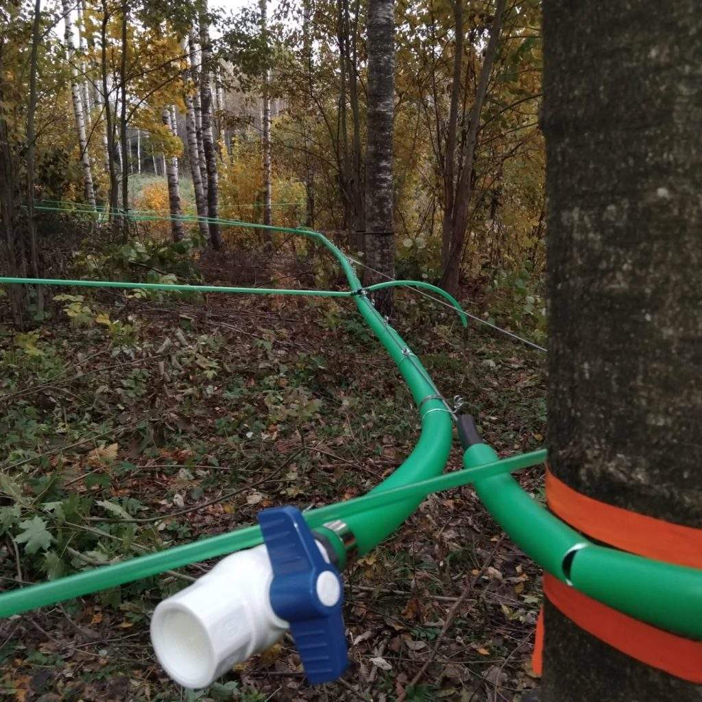 Līdz šim esam vākuši manuāli ar divu veidu sulu vākšanas komplektiem – toveris un rokturis ar maisu, kurus arī piedāvājam klientiem iegādāties, bet šogad esam ieguldījuši Kanādas tehnoloģijā – sistēmā, kas savieno kokus ar caurulēm.
