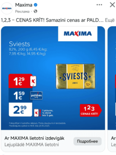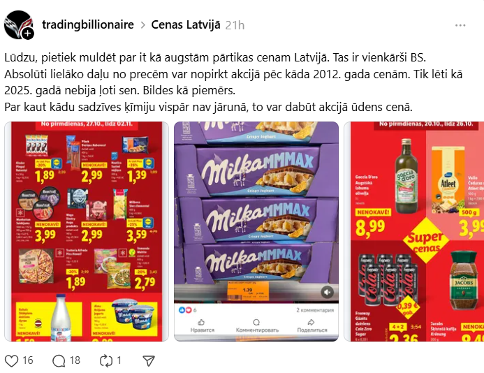 “Lūdzu, pietiek muldēt par it kā augstām pārtikas cenām Latvijā. Tas ir vienkārši BS. Absolūti lielāko daļu no precēm var nopirkt akcijā pēc kāda 2012. gada cenām. Tik lēti kā 2025. gadā nebija ļoti sen. Bildes kā piemērs. Par kaut kādu sadzīves ķīmiju vispār nav jārunā, to var dabūt akcijā ūdens cenā.” profila īpašnieks raksta.