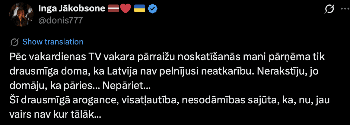 “Pēc vakardienas TV vakara pārraižu noskatīšanās mani pārņēma tik drausmīga doma, ka Latvija nav pelnījusi neatkarību. Nerakstīju, jo domāju, ka pāries… Nepāriet… Šī drausmīgā arogance, visatļautība, nesodāmības sajūta, ka nu jau vairs nav kur tālāk…,” sociālajā vietnē X raksta Inga.