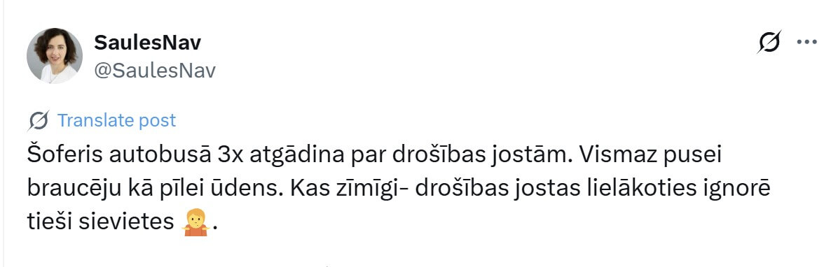 Uz to norāda arī kāda soctīkla “X” lietotāja: “Šoferis autobusā 3x atgādina par drošības jostām. Vismaz pusei braucēju kā pīlei ūdens. Kas zīmīgi- drošības jostas lielākoties ignorē tieši sievietes.”