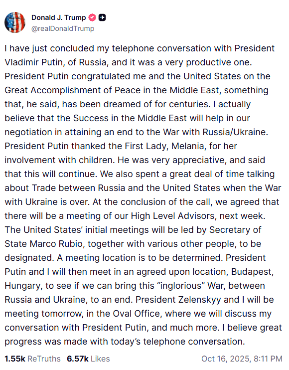 Noslēgusies saruna starp ASV prezidentu Donaldu Trampu un Krievijas diktatoru Vladimiru Putinu. Tramps paziņoja, ka saruna ar Putinu bijusi “ļoti produktīva” un veikts “liels solis uz priekšu”.