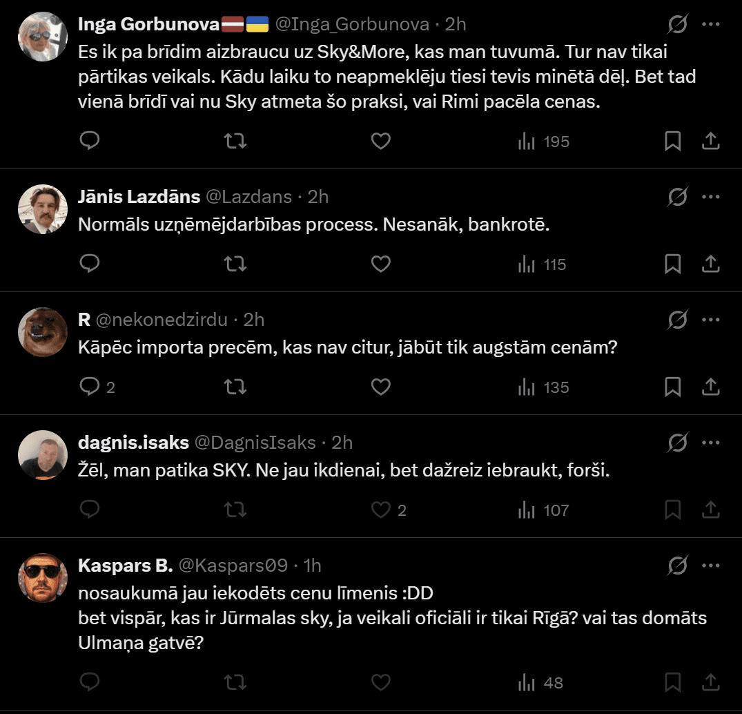 “Nesen aizdomājos par “Sky”, ka gadiem nav tur būts. Izrādās, ka nebūšu arī – šiem beigas. Bet loģiski – pircējs jau nav muļķis. Saprotams, ka augstākas kvalitātes importa precēm, kādas nebija citur, cenas ir lielākas, bet, tas, ka pašmāju produktiem bija 100% uzcenojums…” Juris raksta.