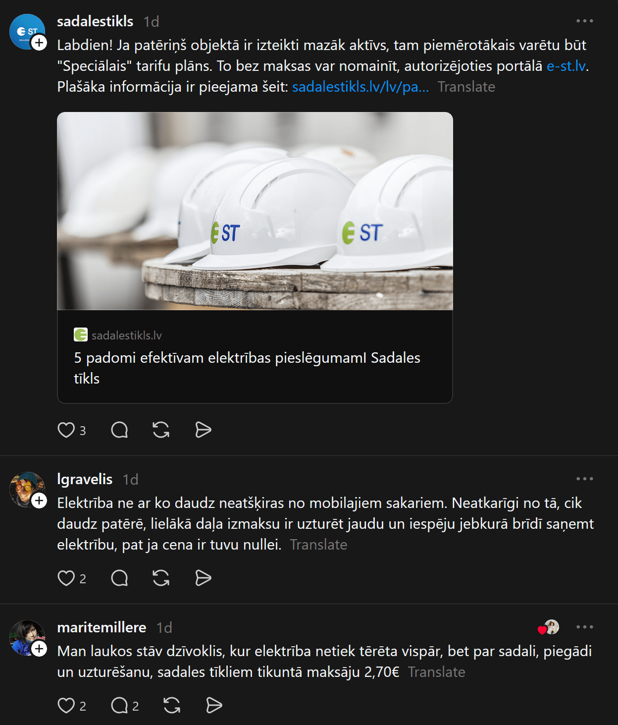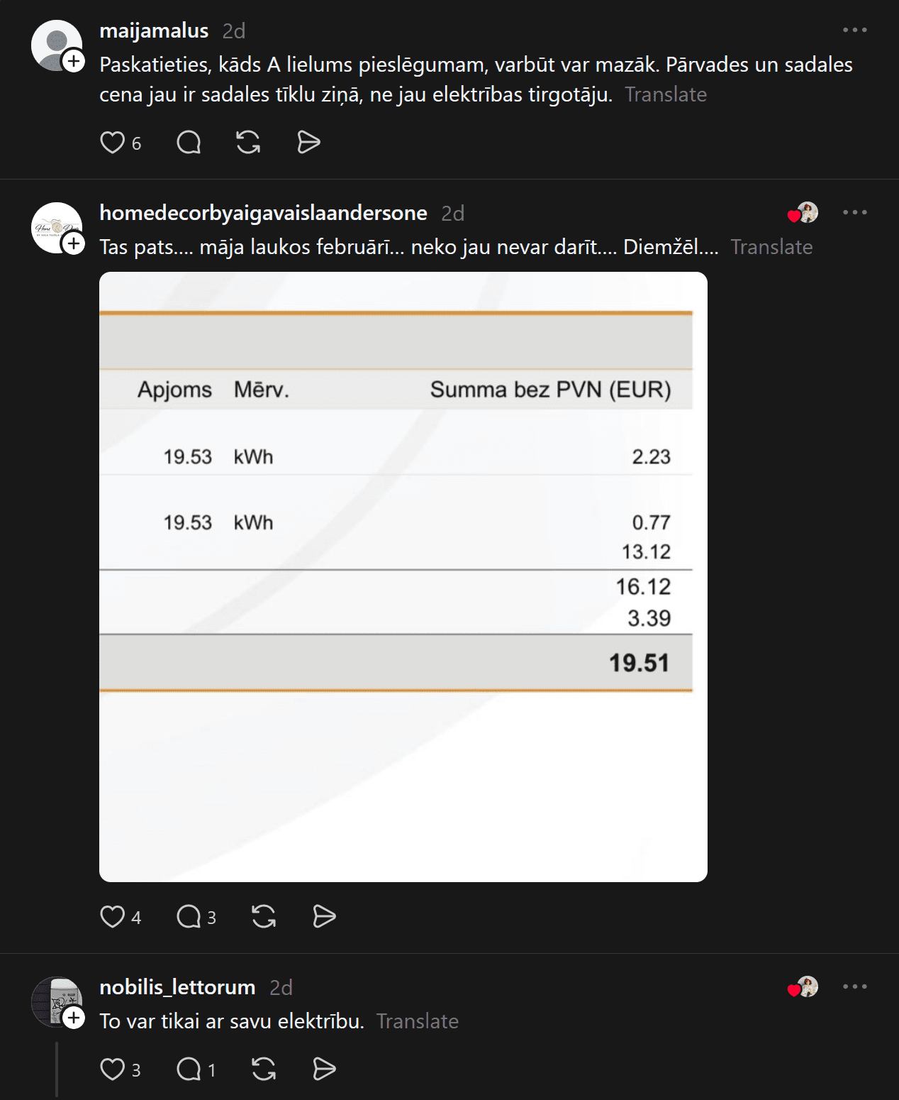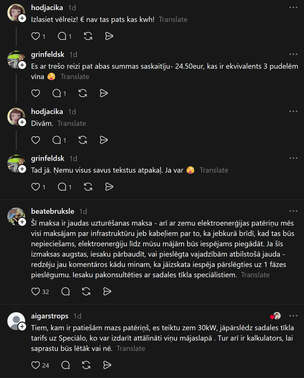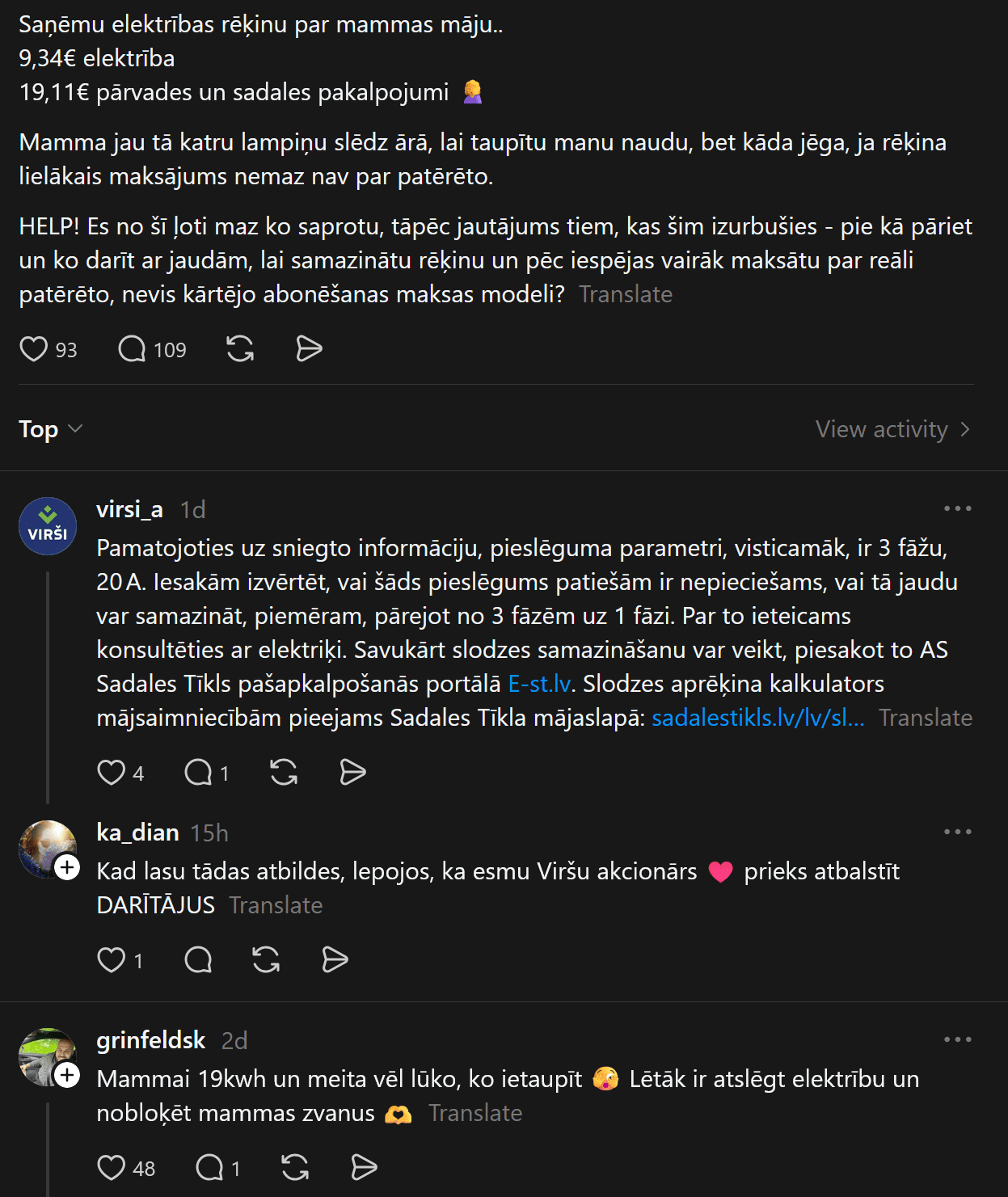 Komentāros cilvēki iesaka, kā rīkoties, daudzi sūkstas, bet starp pārmetumiem un atbalsta vārdiem tiek noskaidrots, ka, iespējams, sievietei pieslēgts trīs fāžu pieslēgums, par kuru ik mēnesi jāmaksā vairāk.