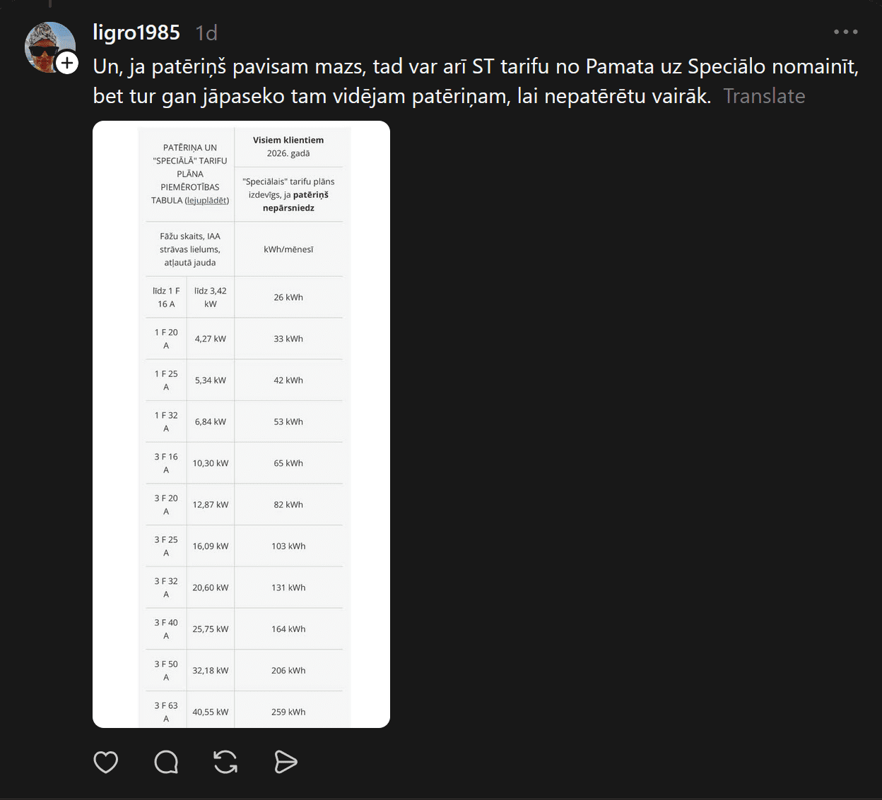 Arī Beāte raksta: “Šī maksa ir jaudas uzturēšanas maksa – arī ar zemu elektroenerģijas patēriņu mēs visi maksājam par infrastruktūru jeb kabeļiem par to, ka jebkurā brīdī, kad tas būs nepieciešams, elektroenerģiju līdz mūsu mājām būs iespējams piegādāt. Ja šīs izmaksas augstas, iesaku pārbaudīt, vai pieslēgta vajadzībām atbilstošā jauda – redzēju jau komentāros kādu minam, ka jāizskata iespēja pārslēgties uz 1 fāzes pieslēgumu. Iesaku pakonsultēties ar sadales tīkla speciālistiem.”
