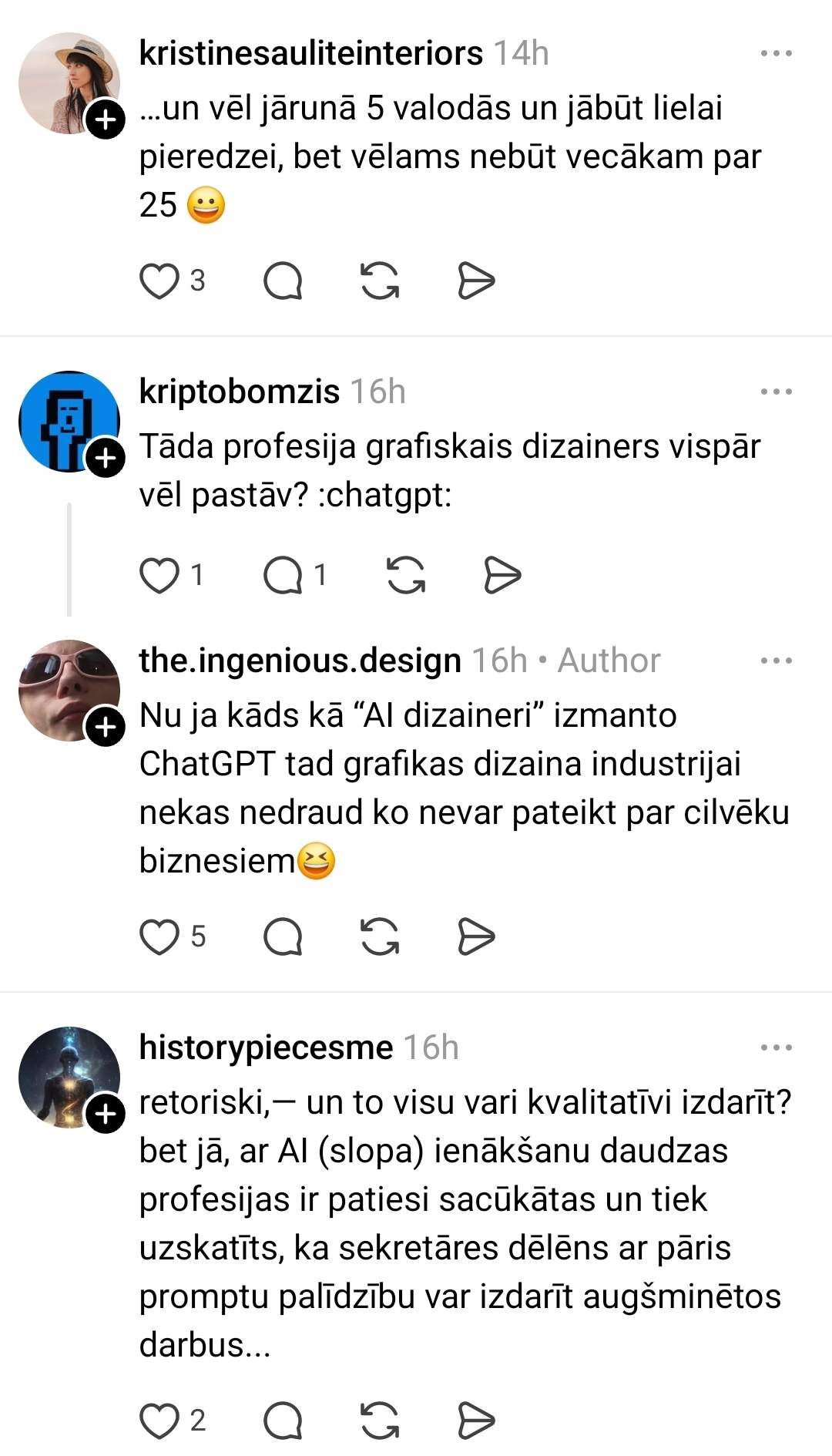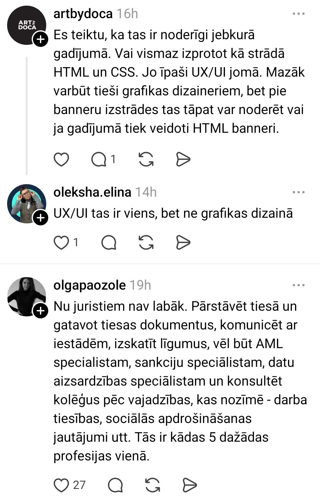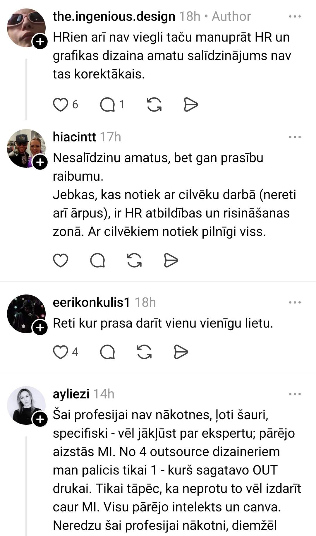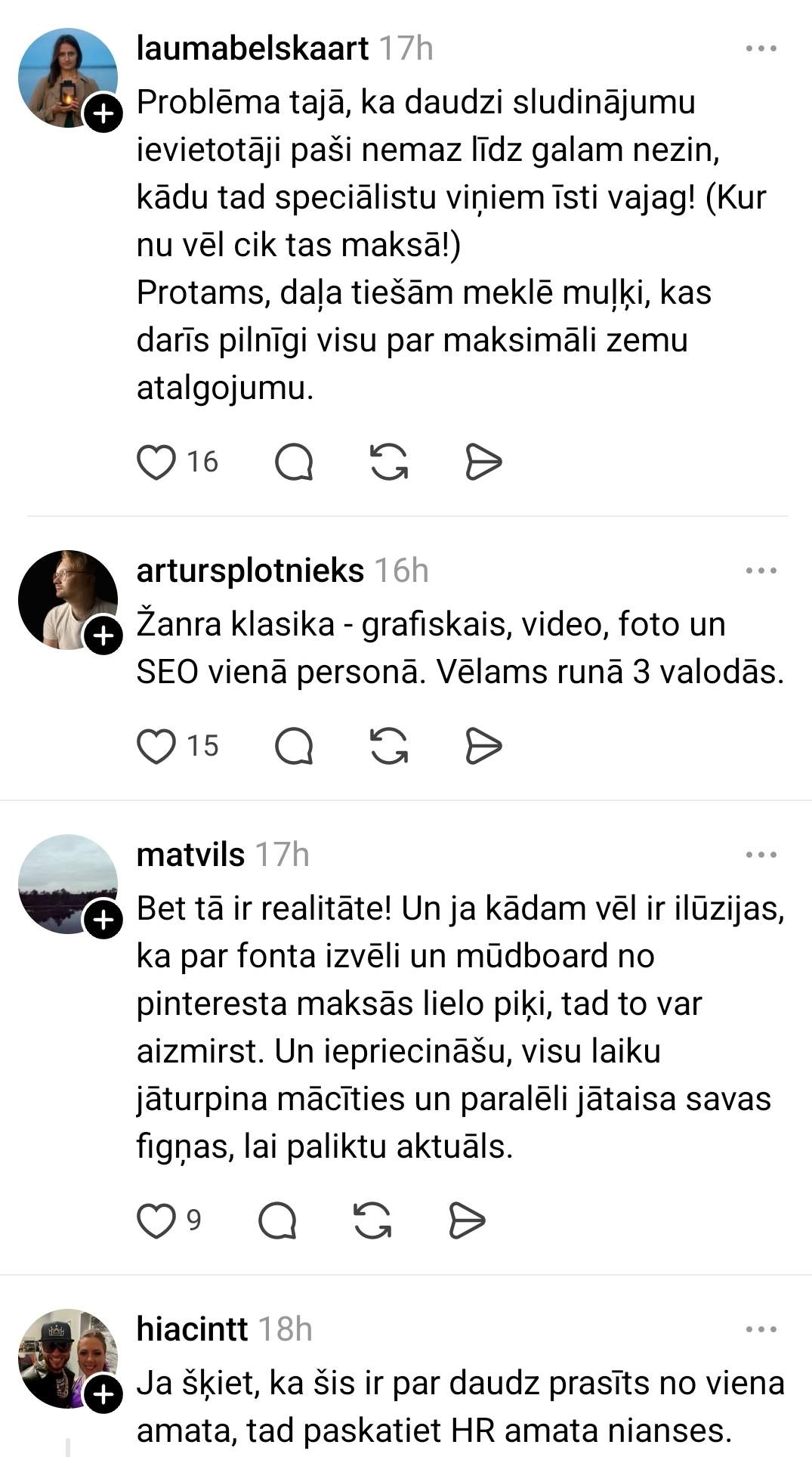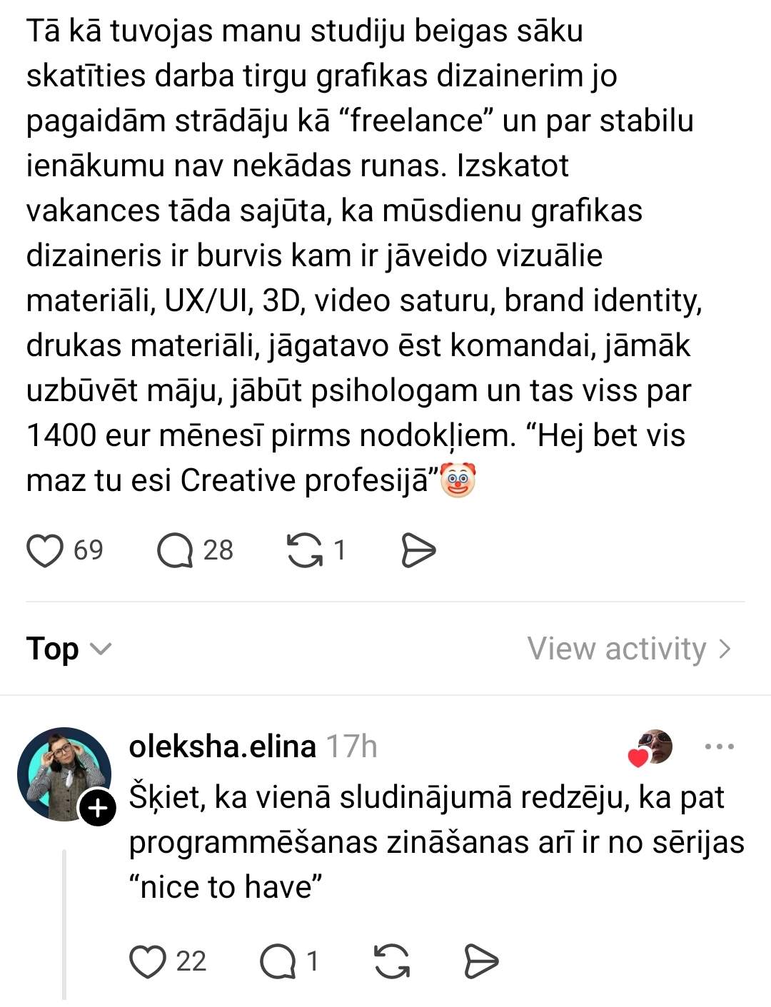 “Tā kā tuvojas manu studiju beigas sāku skatīties darba tirgu grafikas dizainerim, jo pagaidām strādāju kā “freelance” un par stabilu ienākumu nav nekādas runas. Izskatot vakances tāda sajūta, ka mūsdienu grafikas dizaineris ir burvis, kam ir jāveido vizuālie materiāli, UX/UI, 3D, video saturu, brand identity, drukas materiāli, jāgatavo ēst komandai, jāmāk uzbūvēt māju, jābūt psihologam un tas viss par 1400 eiro mēnesī pirms nodokļiem, bet hej bet vis maz tu esi Creative profesijā,” jaunietis ironizē.