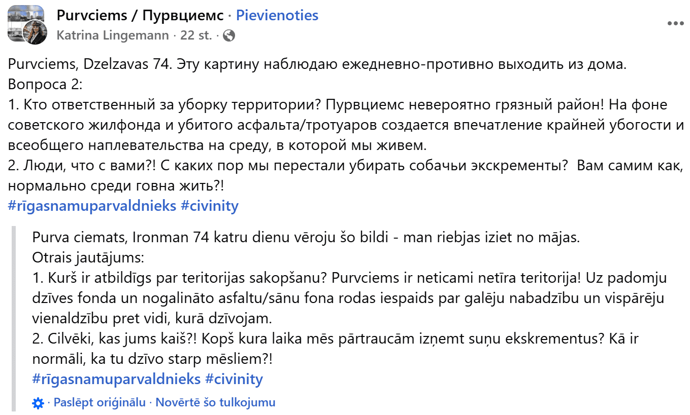 “Purvciems, Dzelzavas 74. Katru dienu redzu šādu ainu – man riebjas iziet no mājas. Divi jautājumi: