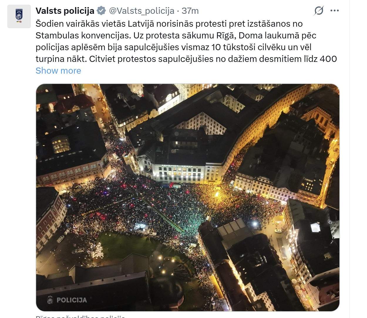 Kā jau ziņots, Doma laukumā protestā pret Latvijas izstāšanos no Stambulas konvencijas ceturtdienas vakarā pulcējušies vismaz 10 000 cilvēku, liecina Valsts policijas aplēses.