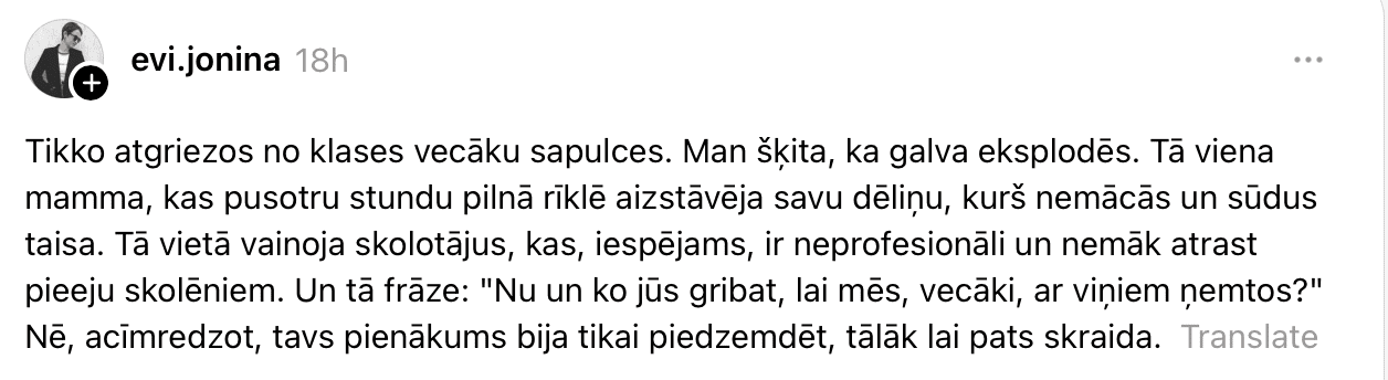 “Tikko atgriezos no klases vecāku sapulces. Man šķita, ka galva eksplodēs. Tā viena mamma, kas pusotru stundu pilnā rīklē aizstāvēja savu dēliņu, kurš nemācās un sūdus taisa. Tā vietā vainoja skolotājus, kas, iespējams, ir neprofesionāli un nemāk atrast pieeju skolēniem. Un tā frāze: “Nu un ko jūs gribat, lai mēs, vecāki, ar viņiem ņemtos?” Nē, acīmredzot tavs pienākums bija tikai piedzemdēt, tālāk lai pats skraida,” platformā “Threads” raksta @evi.jonina.