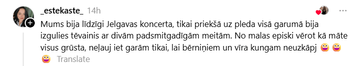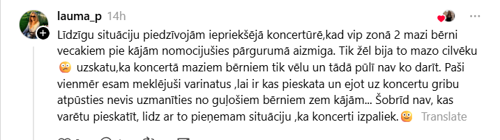 Taču koncerts neiztika arī bez pārsteiguma brīžiem, gan labiem, gan brīžiem mazliet satraucošiem. Sociālajā tīklā “Threads” koncerta apmeklētāja Patrīcija dalījusies ar piedzīvoto, uzsverot, ka reizēm vecāku rīcība mēdz pārsteigt. Viņa raksta: