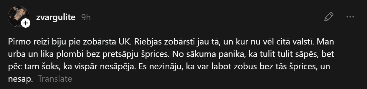 Kāda soctīklotāja dalījusies savā pieredzē, apmeklējot zobārstu Anglijā – viņai veiktas manipulācijas bez pretsāpju šprices.