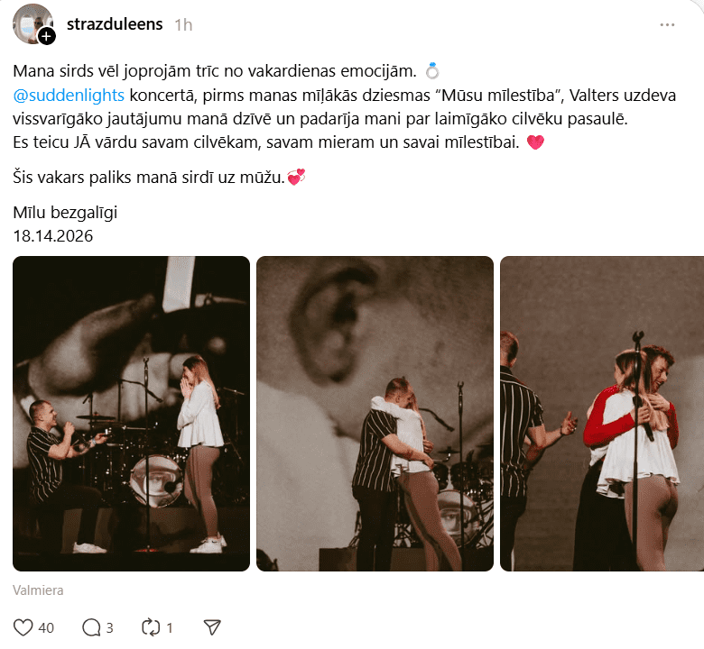 Kā vēstījām, vakar, 18. aprīlī, Valmieras Olimpiskajā centrā valdīja neaizmirstama atmosfēra. Grupas “Sudden Lights” koncerta laikā klātesošie kļuva par lieciniekiem kādam ļoti personiskam un aizkustinošam brīdim – bildinājumam. Šodien ar savām emocijām sociālo tīklu platformā “Threads” dalījusies arī pati līgava.