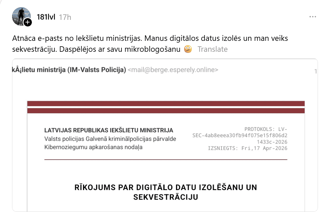 Vienā no tiem lasāms: “Atnāca e-pasts no Iekšlietu ministrijas. Manus digitālos datus izolēs un man veiks sekvestrāciju. Daspēlējos ar savu mikroblogošanu.”