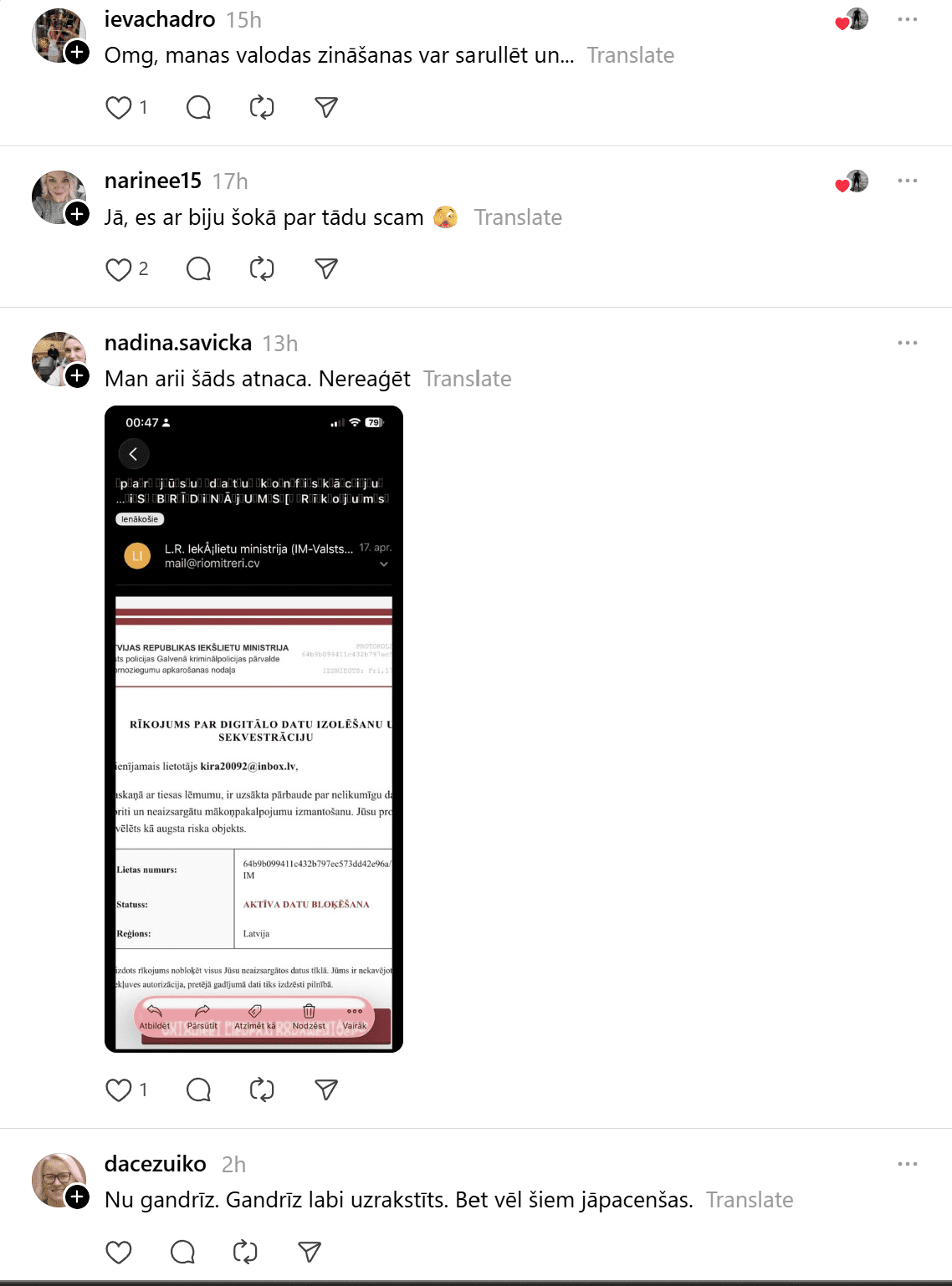 Arvien vairāk cilvēku pie šādiem ierakstiem piebilst, ka līdzīgas vēstules nonākušas arī viņu e-pastos.