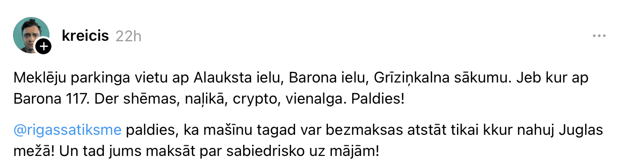 Vietnē “Threads” viņš raksta: “Meklēju parkinga vietu ap Alauksta ielu, Barona ielu, Grīziņkalna sākumu. Jebkur ap Barona 117. Der shēmas, naļikā, crypto, vienalga. Paldies! Rīgas satiksme, paldies, ka mašīnu tagad var bezmaksas atstāt tikai kaut kur nahuj Juglas mežā! Un tad jums maksāt par sabiedrisko uz mājām!”