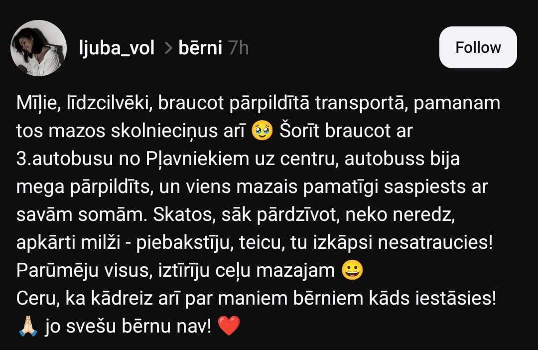 “Mīļie līdzcilvēki, braucot pārpildītā transportā, pamanām tos mazos skolnieciņus arī. Šorīt, braucot ar 3. autobusu no Pļavniekiem uz centru, autobuss bija mega pārpildīts, un viens mazais pamatīgi saspiests ar savām somām.