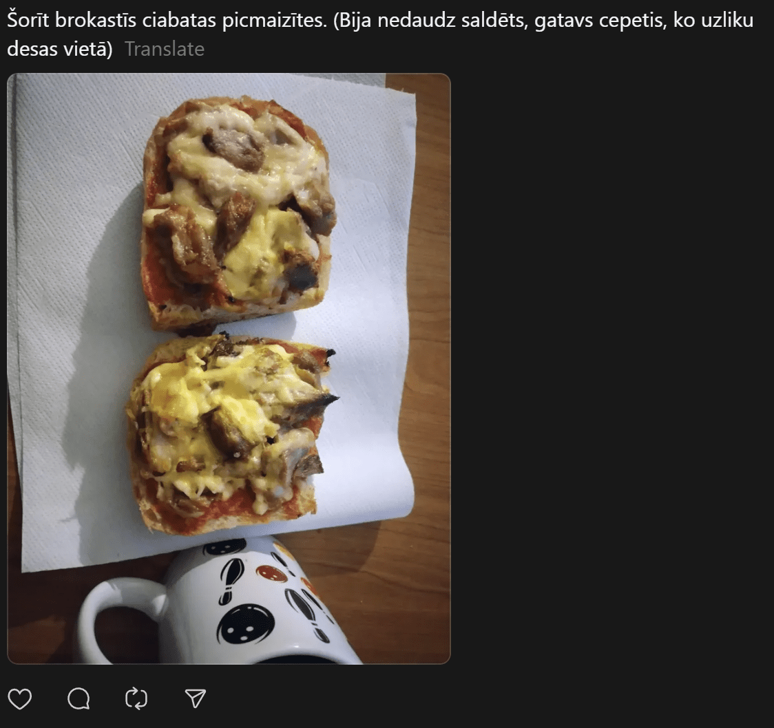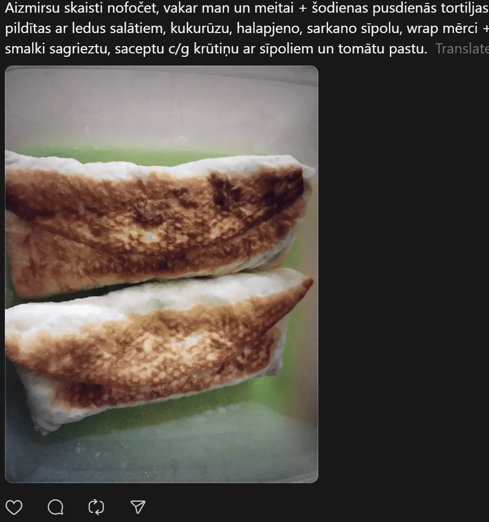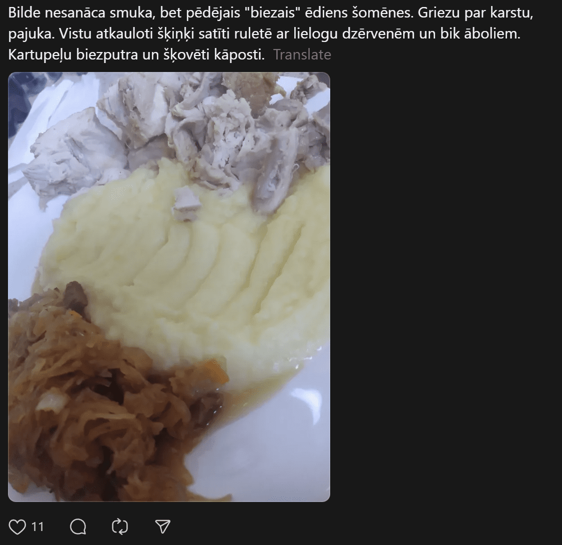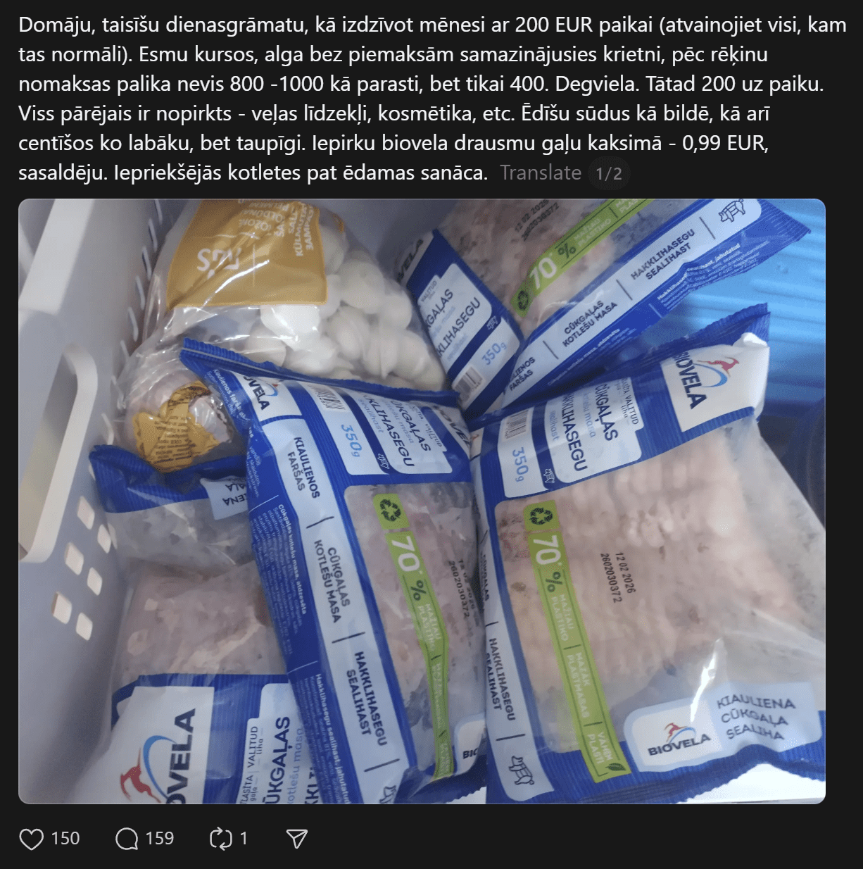 Vīrietis raksta: “Domāju, taisīšu dienasgrāmatu, kā izdzīvot mēnesi ar 200 EUR ēdienam (atvainojiet visi, kam tas normāli). Esmu kursos, alga bez piemaksām samazinājusies krietni, pēc rēķinu nomaksas palika nevis 800 -1000 kā parasti, bet tikai 400. Degviela. Tātad 200 uz paiku. Viss pārējais ir nopirkts – veļas līdzekļi, kosmētika, etc. Ēdīšu sūdus kā bildē, kā arī centīšos ko labāku, bet taupīgi. Iepirku biovela drausmu gaļu Maximā – 0,99 eiro, sasaldēju. Iepriekšējās kotletes pat ēdamas sanāca.”