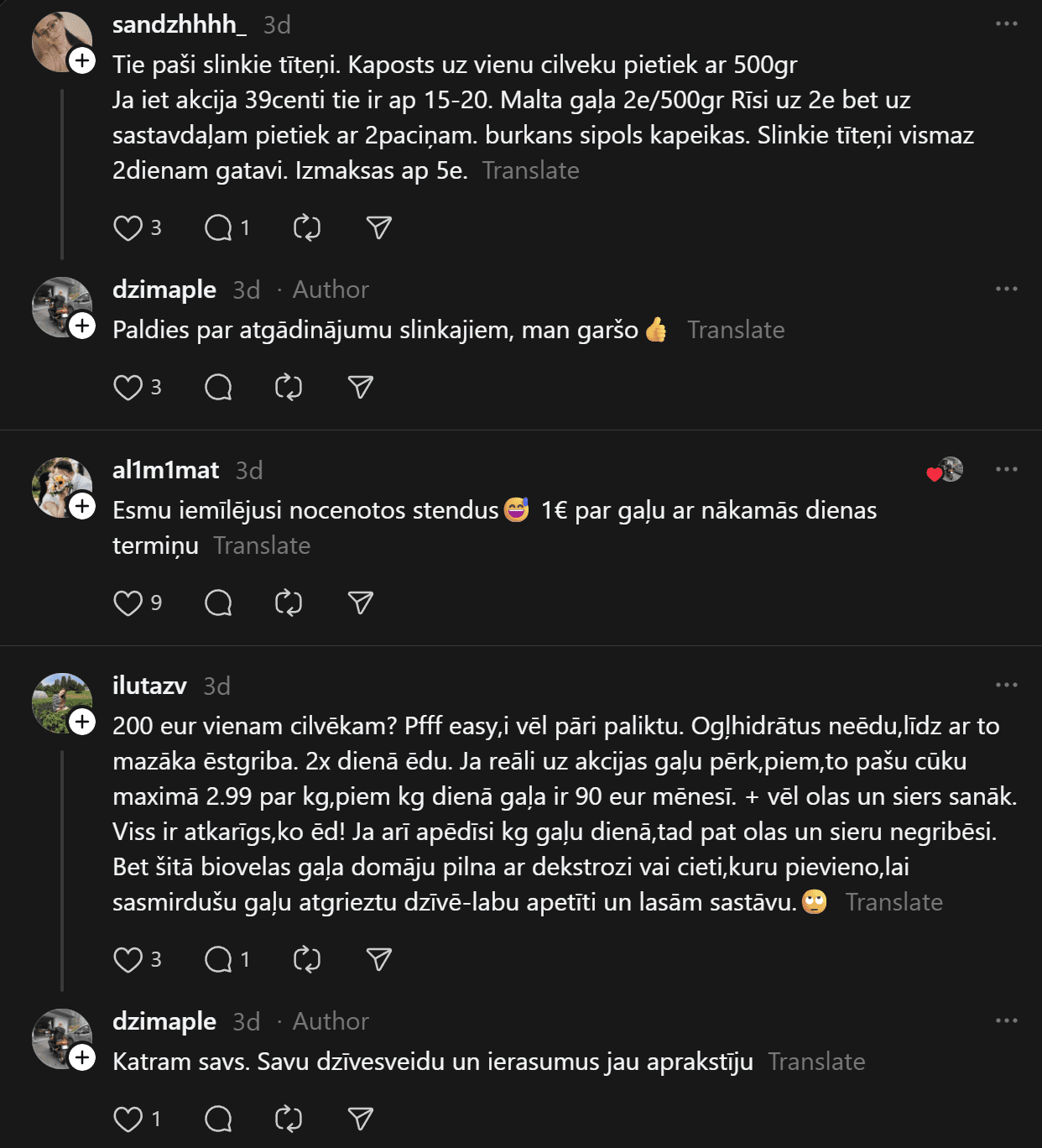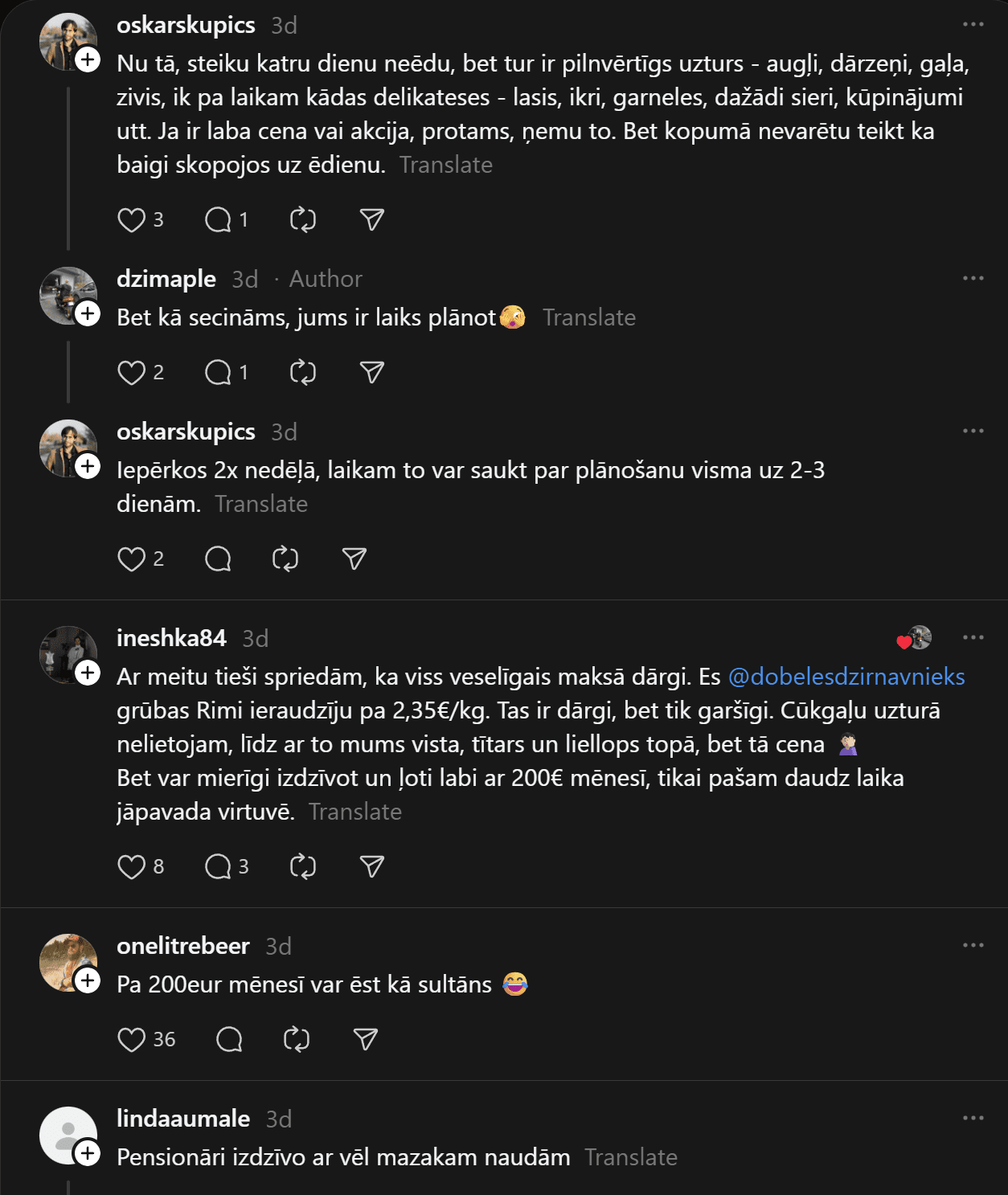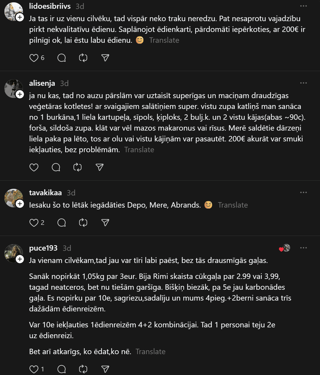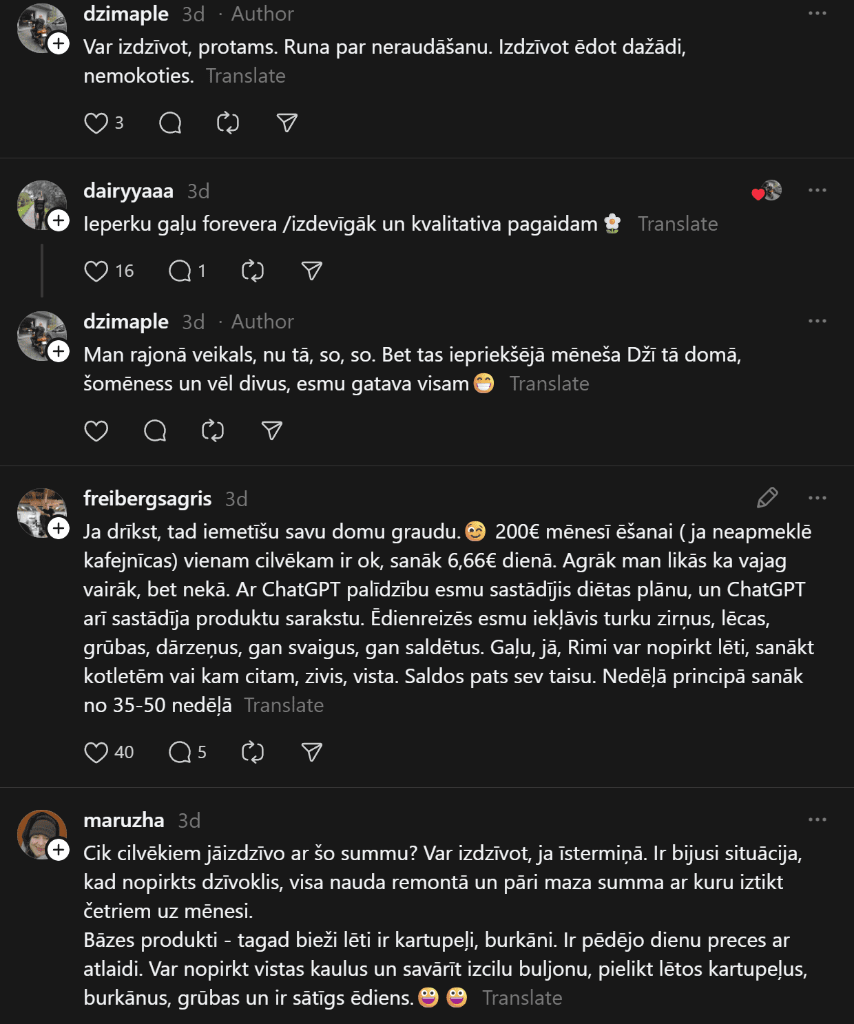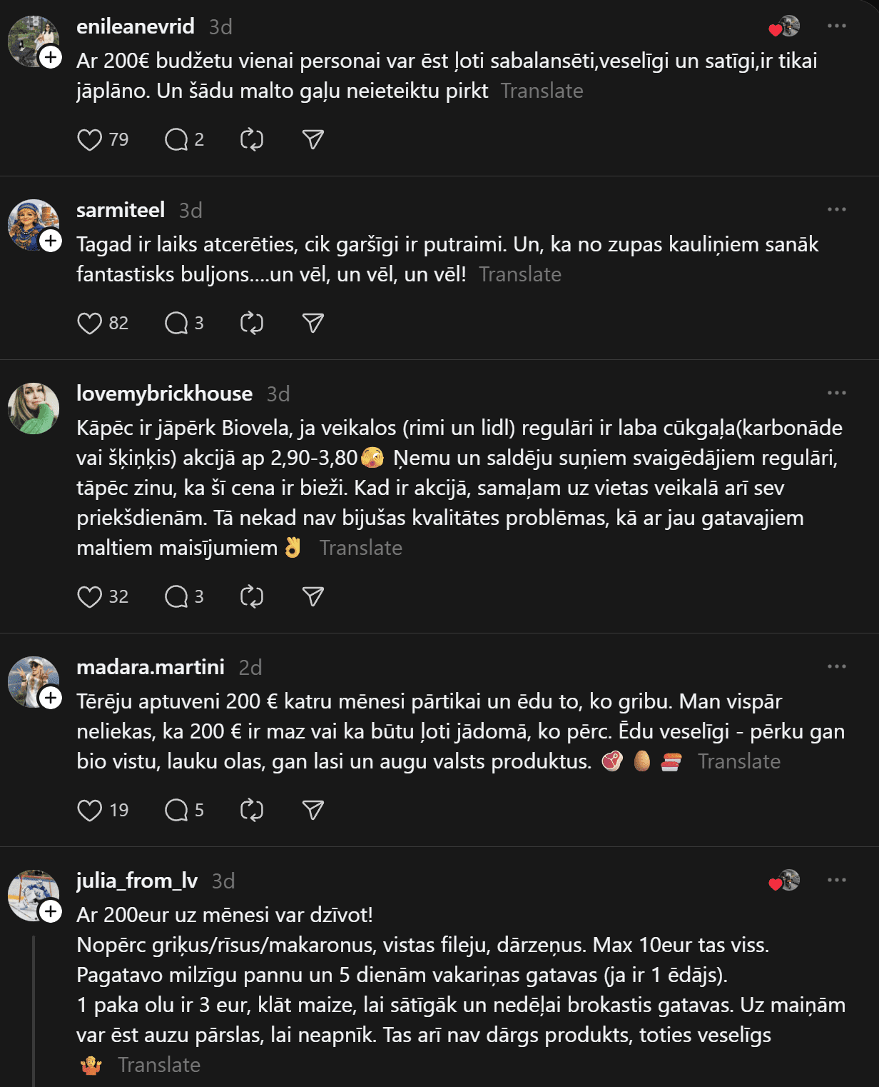“200 eiro mēnesī ēšanai (ja neapmeklē kafejnīcas) vienam cilvēkam ir ok, sanāk 6,66 eiro dienā. Agrāk man likās ka vajag vairāk, bet nekā. Ar ChatGPT palīdzību esmu sastādījis diētas plānu, un ChatGPT arī sastādīja produktu sarakstu. Ēdienreizēs esmu iekļāvis turku zirņus, lēcas, grūbas, dārzeņus, gan svaigus, gan saldētus. Gaļu, jā, “Rimi” var nopirkt lēti, sanākt kotletēm vai kam citam, zivis, vista. Saldos pats sev taisu. Nedēļā principā sanāk no 35-50 nedēļā.”