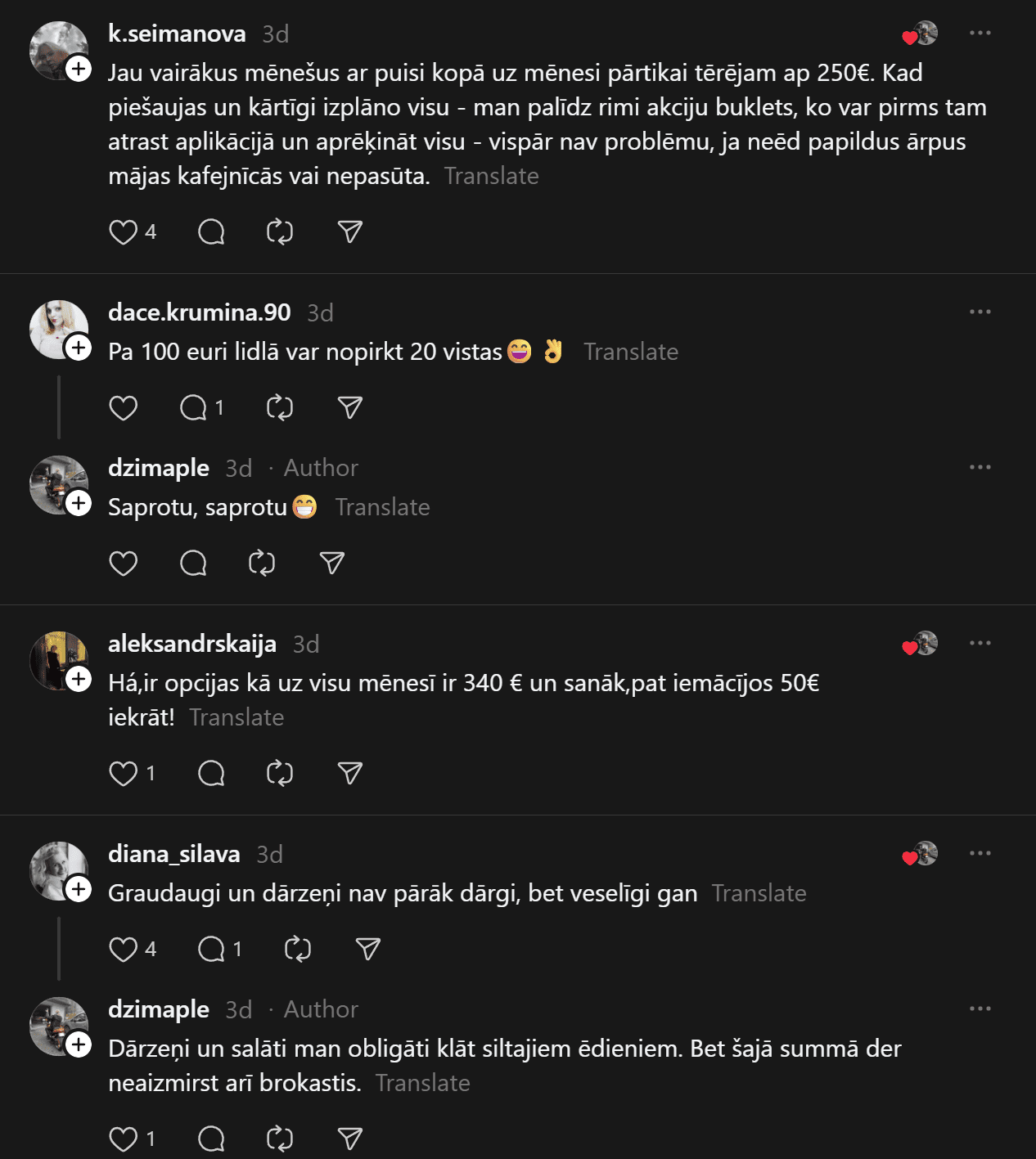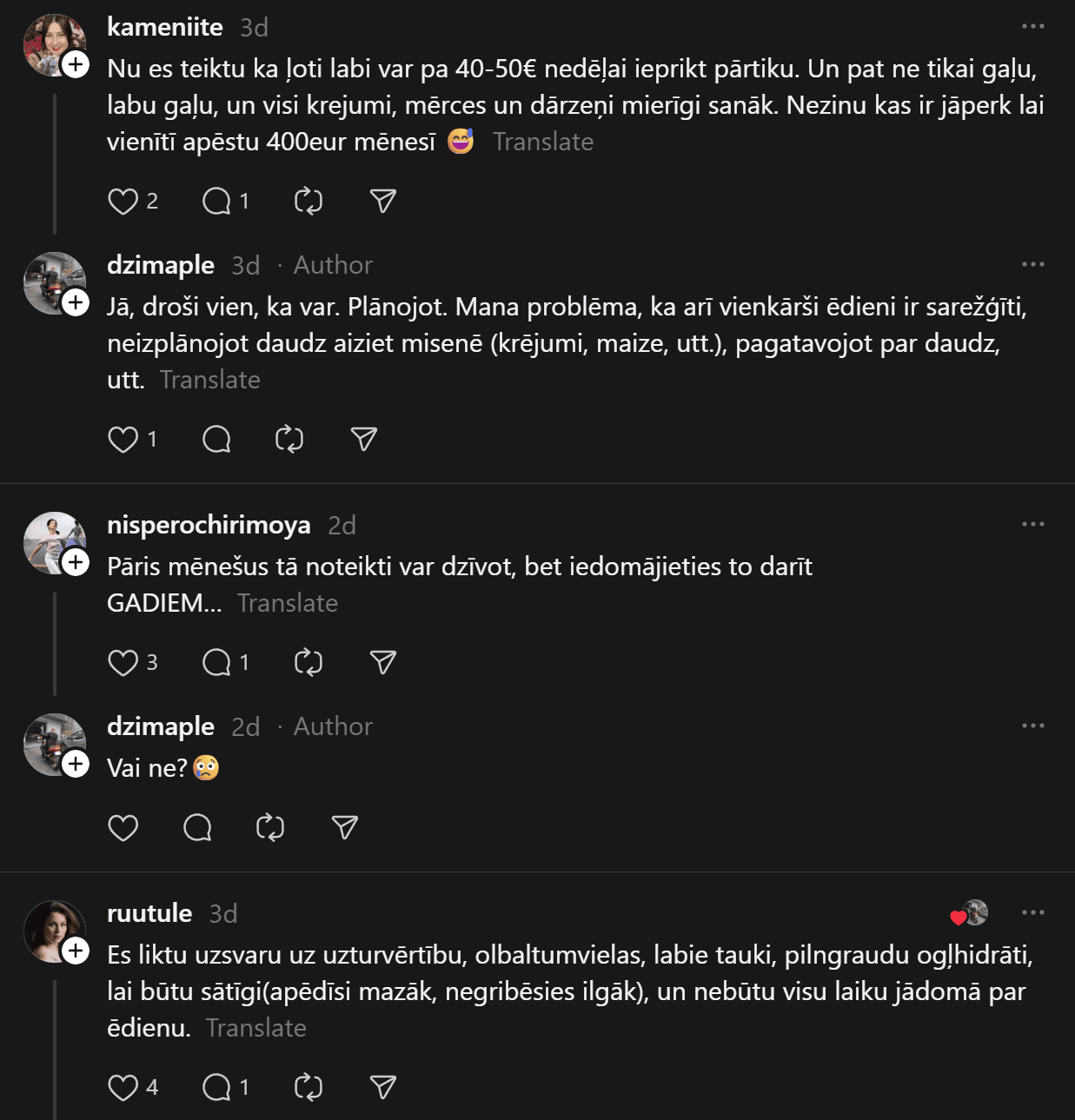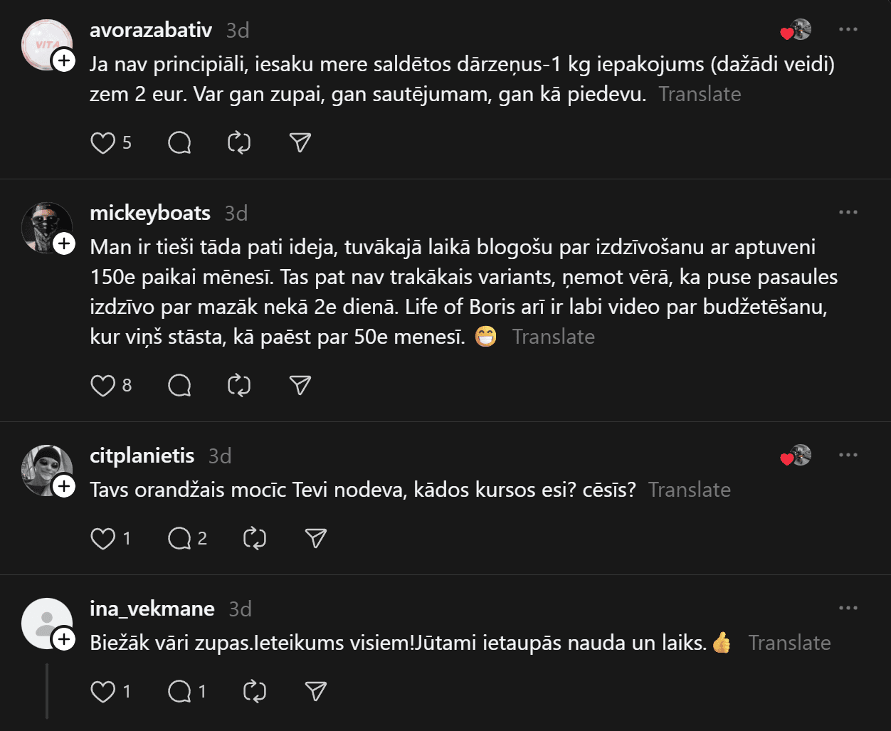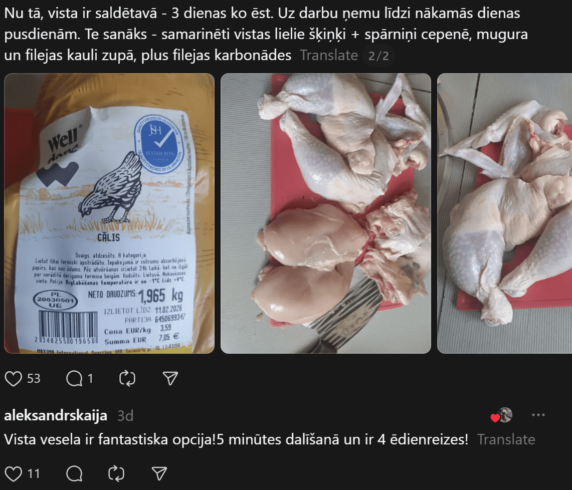 “200 eiro mēnesī ēšanai (ja neapmeklē kafejnīcas) vienam cilvēkam ir ok, sanāk 6,66 eiro dienā. Agrāk man likās ka vajag vairāk, bet nekā. Ar ChatGPT palīdzību esmu sastādījis diētas plānu, un ChatGPT arī sastādīja produktu sarakstu. Ēdienreizēs esmu iekļāvis turku zirņus, lēcas, grūbas, dārzeņus, gan svaigus, gan saldētus. Gaļu, jā, “Rimi” var nopirkt lēti, sanākt kotletēm vai kam citam, zivis, vista. Saldos pats sev taisu. Nedēļā principā sanāk no 35-50 nedēļā.”