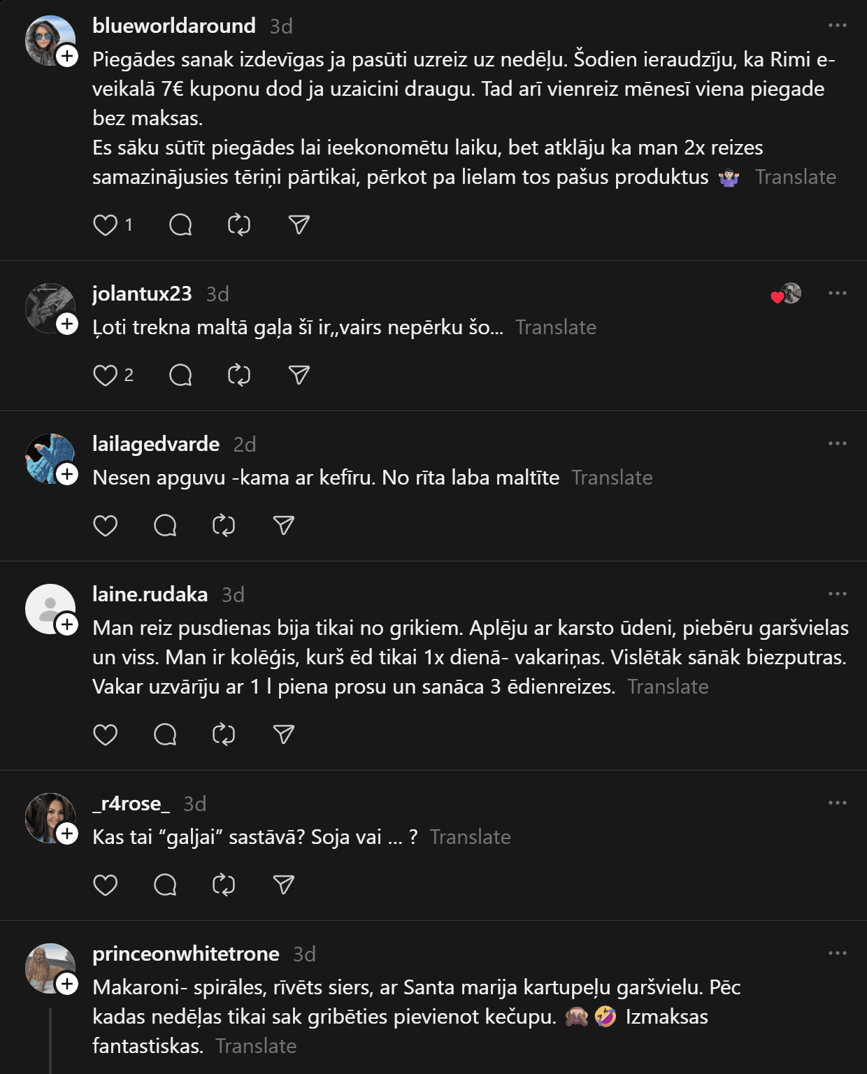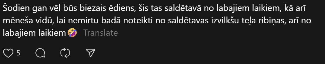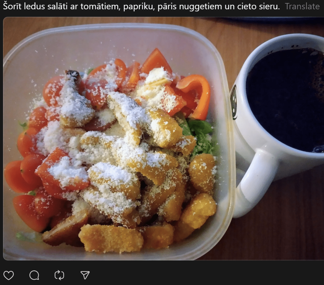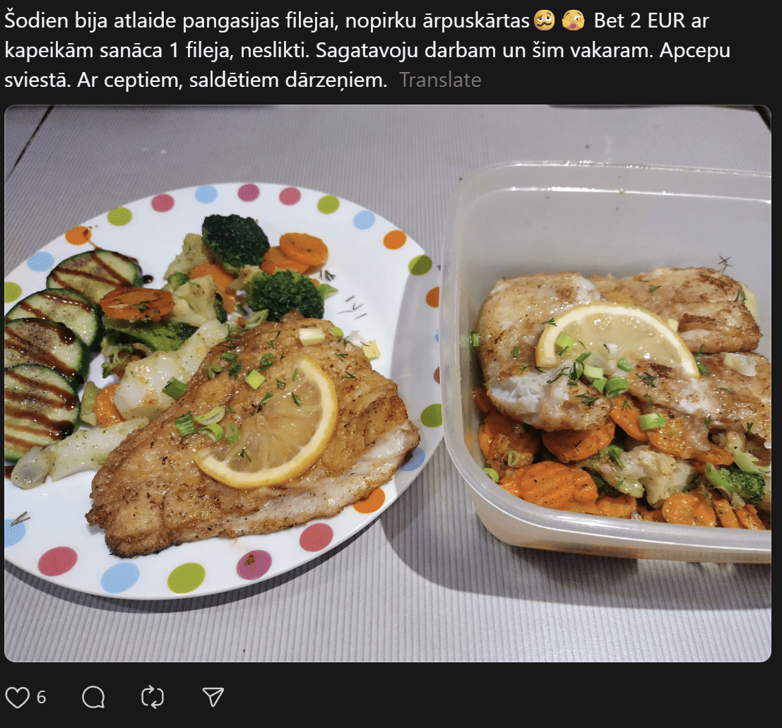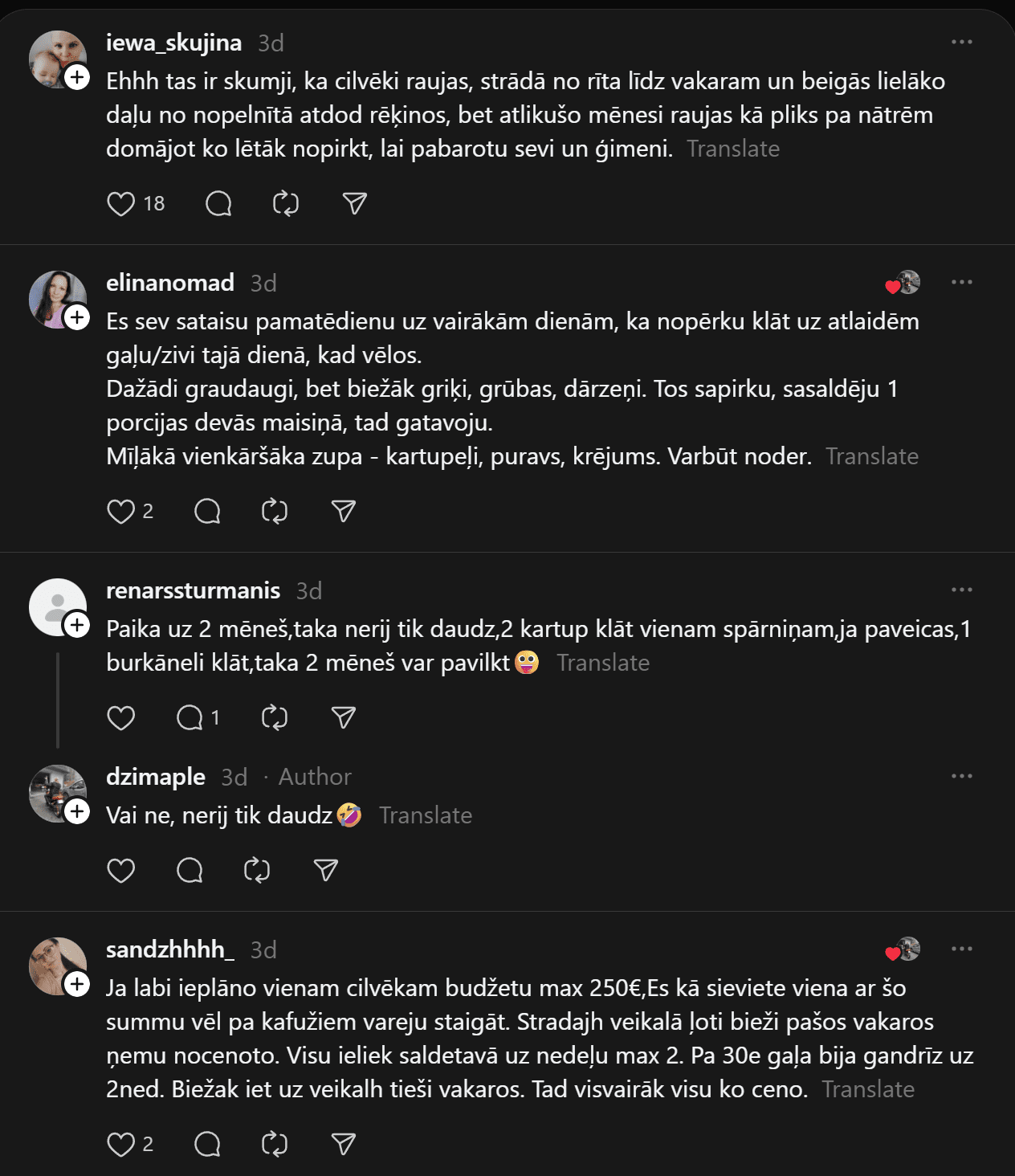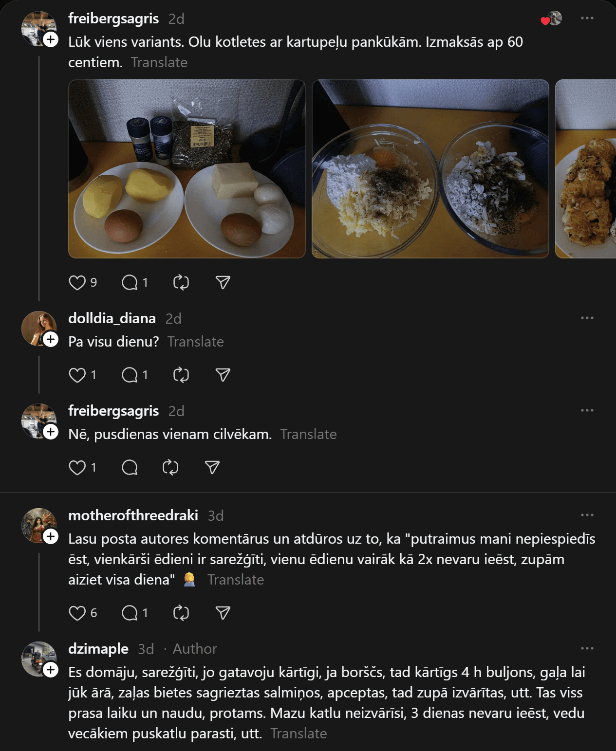 “200 eiro mēnesī ēšanai (ja neapmeklē kafejnīcas) vienam cilvēkam ir ok, sanāk 6,66 eiro dienā. Agrāk man likās ka vajag vairāk, bet nekā. Ar ChatGPT palīdzību esmu sastādījis diētas plānu, un ChatGPT arī sastādīja produktu sarakstu. Ēdienreizēs esmu iekļāvis turku zirņus, lēcas, grūbas, dārzeņus, gan svaigus, gan saldētus. Gaļu, jā, “Rimi” var nopirkt lēti, sanākt kotletēm vai kam citam, zivis, vista. Saldos pats sev taisu. Nedēļā principā sanāk no 35-50 nedēļā.”
