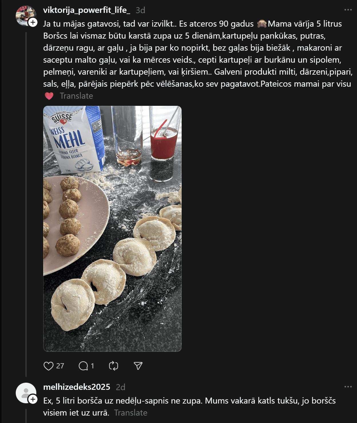 “Ja tu mājas gatavosi, tad var izvilkt. Es atceros 90 gadus. Mamma vārīja 5 litrus boršča, lai vismaz būtu karstā zupa uz 5 dienām, kartupeļu pankūkas, putras, dārzeņu ragu, ar gaļu, ja bija par ko nopirkt, bez gaļas bija biežāk, makaroni ar saceptu malto gaļu, vai ka mērces dažādi veidi, cepti kartupeļi ar burkānu un sipoliem, pelmeņi, vareniki ar kartupeļiem, vai ķiršiem. Galveni produkti – milti, dārzeni, pipari, sals, eļļa, pārējais piepērk pēc vēlēšanas, ko sev pagatavot.”