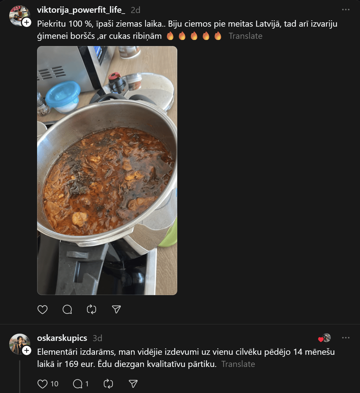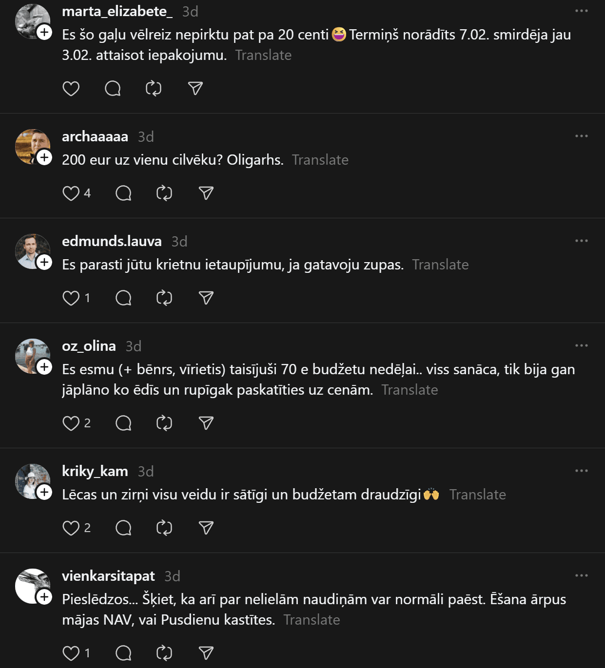 Komentāros ļaudis norāda, ka 200 eiro vienam cilvēkam ir pietiekami. Kāds cits brīnās, ka ar tik minimālu summu noteikti nav iespējams iegādāties veselīgu pārtiku. Daudzi šajā aukstajā laikā iesaka vārīt vairāk zupas – garšīgi un lēti. Lūk, pāris komentētāju ieteikumu: