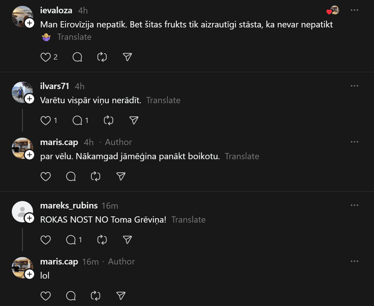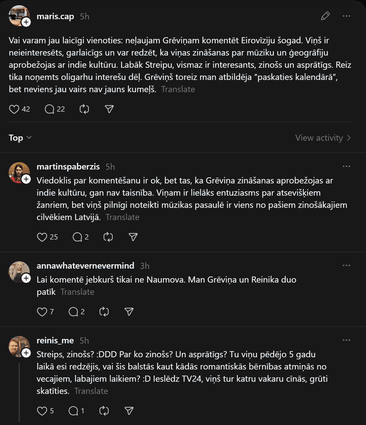 “Vai varam jau laicīgi vienoties: neļaujam Grēviņam komentēt Eirovīziju šogad. Viņš ir neieinteresēts, garlaicīgs un var redzēt, ka viņas zināšanas par mūziku un ģeogrāfiju aprobežojas ar indie kultūru. Labāk Streipu, vismaz ir interesants, zinošs un asprātīgs. Reiz tika noņemts oligarhu interešu dēļ. Grēviņš toreiz man atbildēja “paskaties kalendārā”, bet neviens jau vairs nav jauns kumeļš,” Māris raksta.