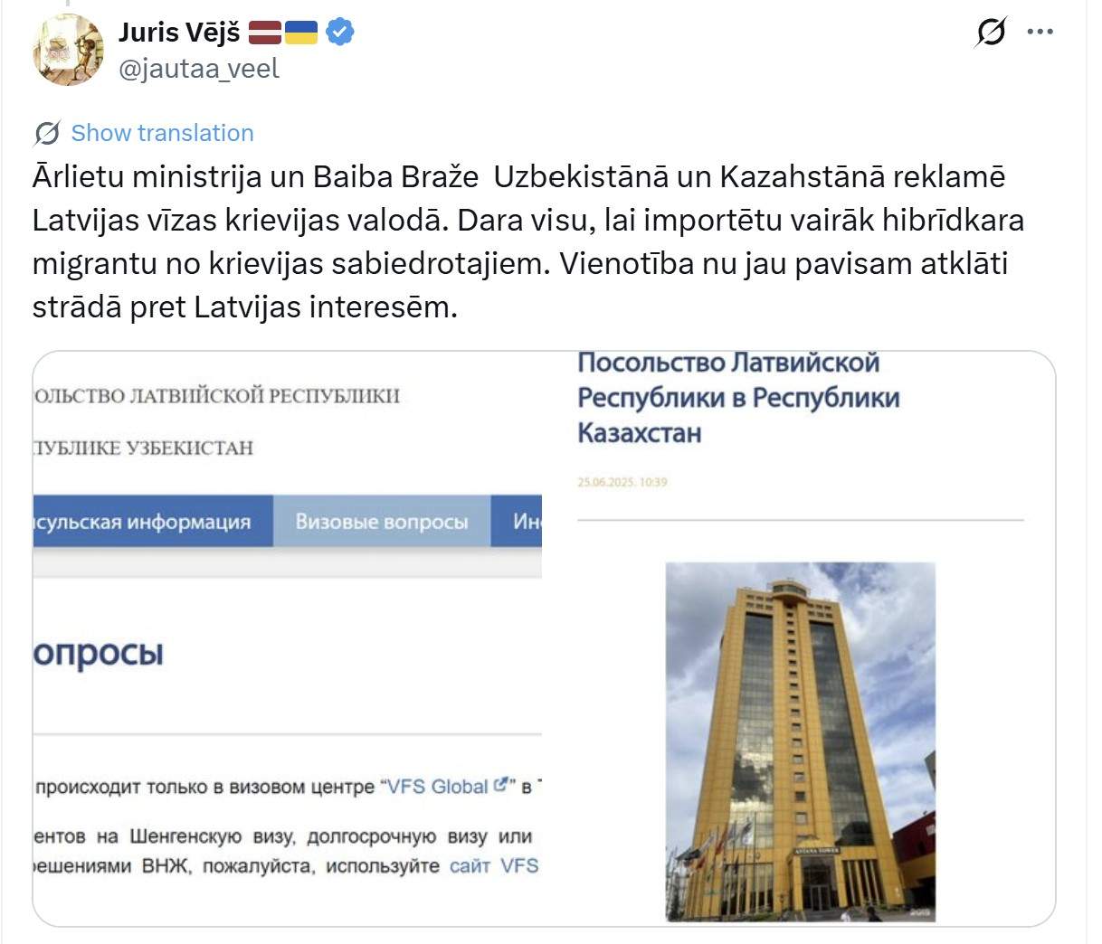 Juris Vējš norāda: “Ārlietu ministrija un Baiba Braže Uzbekistānā un Kazahstānā reklamē Latvijas vīzas krievijas valodā. Dara visu, lai importētu vairāk hibrīdkara migrantu no krievijas sabiedrotajiem. Vienotība nu jau pavisam atklāti strādā pret Latvijas interesēm.”