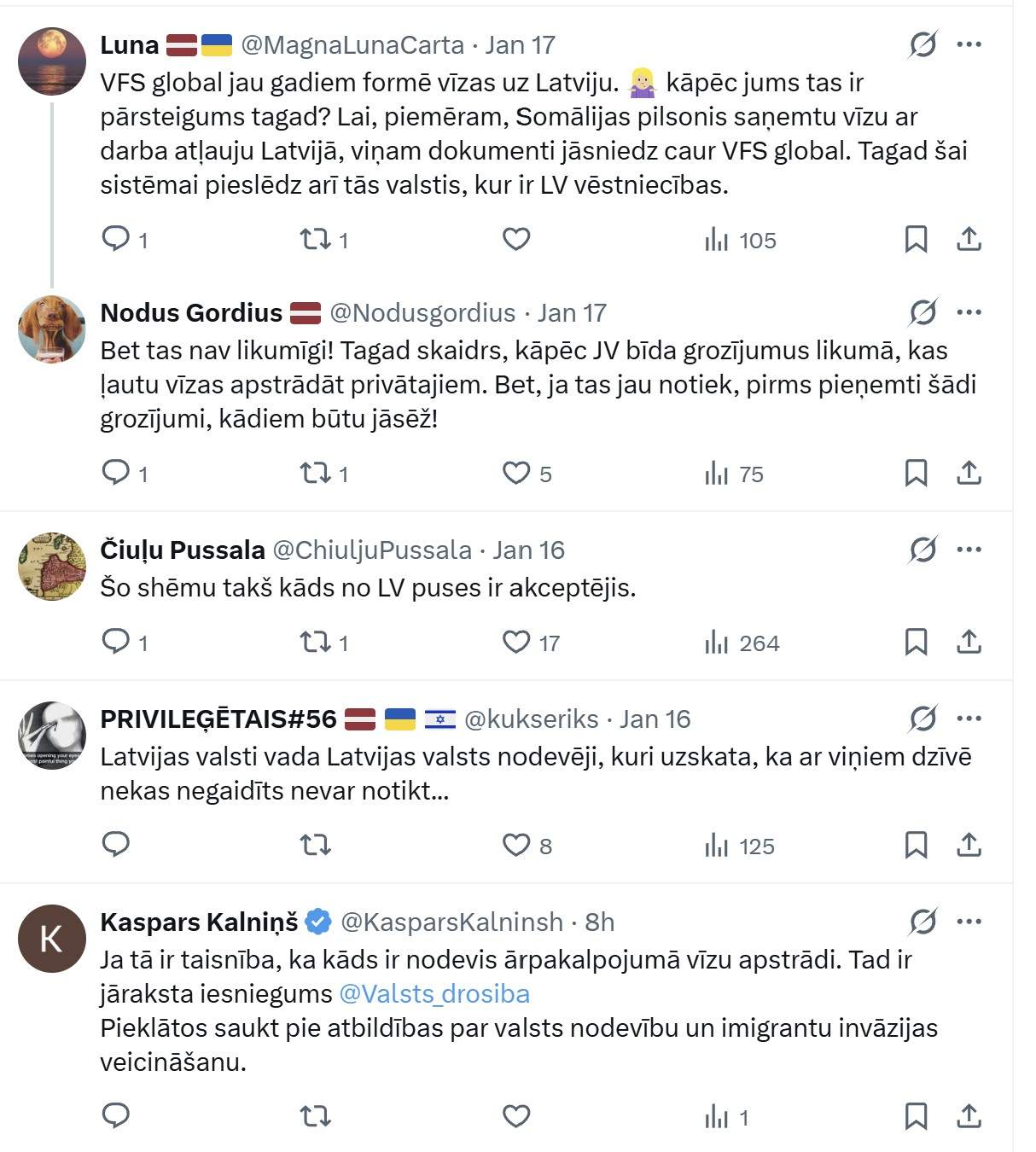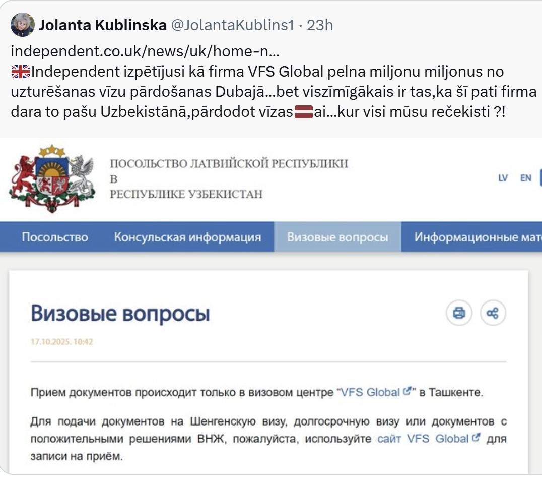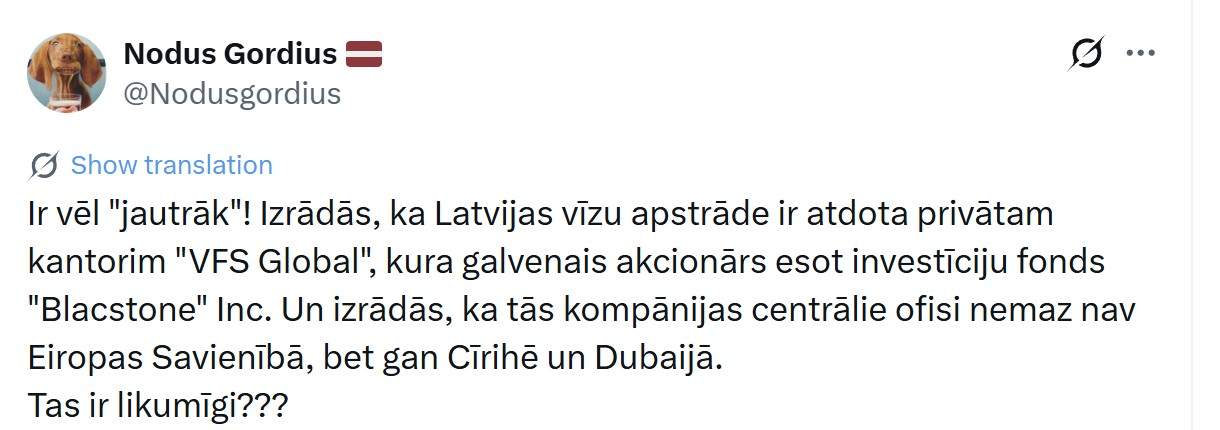 Kāds piefiksējis, ka iepriekšminētajā rakstā atmaskotais uzņēmums tirgo arī vīzas uz Latviju: “Ir vēl “jautrāk”! Izrādās, ka Latvijas vīzu apstrāde ir atdota privātam kantorim “VFS Global”, kura galvenais akcionārs esot investīciju fonds “Blacstone” Inc. Un izrādās, ka tās kompānijas centrālie ofisi nemaz nav Eiropas Savienībā, bet gan Cīrihē un Dubaijā. Tas ir likumīgi???”