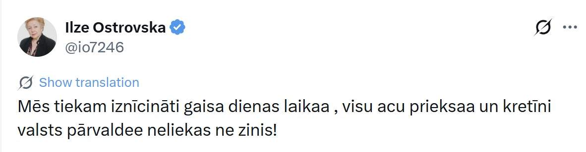 Trauksmi ceļ arī politoloģe Ilze Ostrovska, norādot: “Mēs tiekam iznīcināti gaišā dienas laikā, visu acu priekšā, un kretīni valsts pārvaldē neliekas ne zinis!”