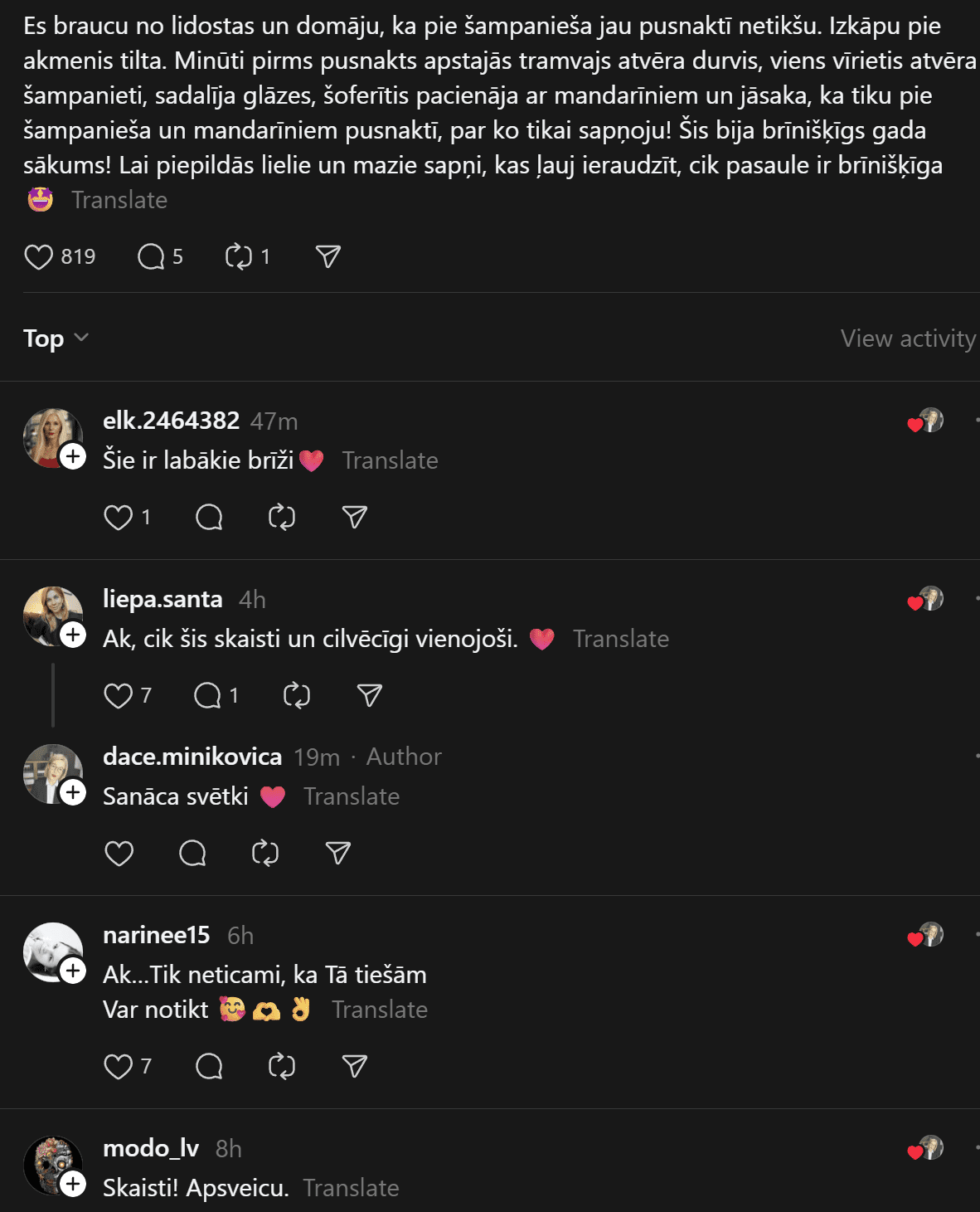 “Es braucu no lidostas un domāju, ka pie šampanieša jau pusnaktī netikšu. Izkāpu pie akmenis tilta. Minūti pirms pusnakts apstajās tramvajs atvēra durvis, viens vīrietis atvēra šampanieti, sadalīja glāzes, šoferītis pacienāja ar mandarīniem un jāsaka, ka tiku pie šampanieša un mandarīniem pusnaktī, par ko tikai sapņoju! Šis bija brīnišķīgs gada sākums! Lai piepildās lielie un mazie sapņi, kas ļauj ieraudzīt, cik pasaule ir brīnišķīga,” Dace Threads soctīklā raksta.