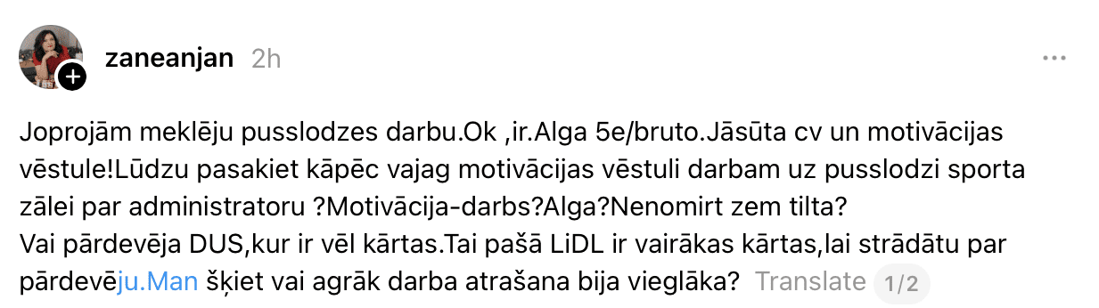 “Joprojām meklēju pusslodzes darbu. Ok, ir. Alga – 5 eiro bruto. Jāsūta CV un motivācijas vēstule! Lūdzu, pasakiet, kāpēc vajag motivācijas vēstuli darbam uz pusslodzi sporta zālē par administratoru? Motivācija – darbs? Alga? Nenomirt zem tilta? Vai pārdevēja DUS, kur ir vēl kārtas. Tajā pašā “Lidl” ir vairākas kārtas, lai strādātu par pārdevēju. Man šķiet, vai agrāk darba atrašana bija vieglāka?” vietnē “Threads” neizpratnē ir Zane.