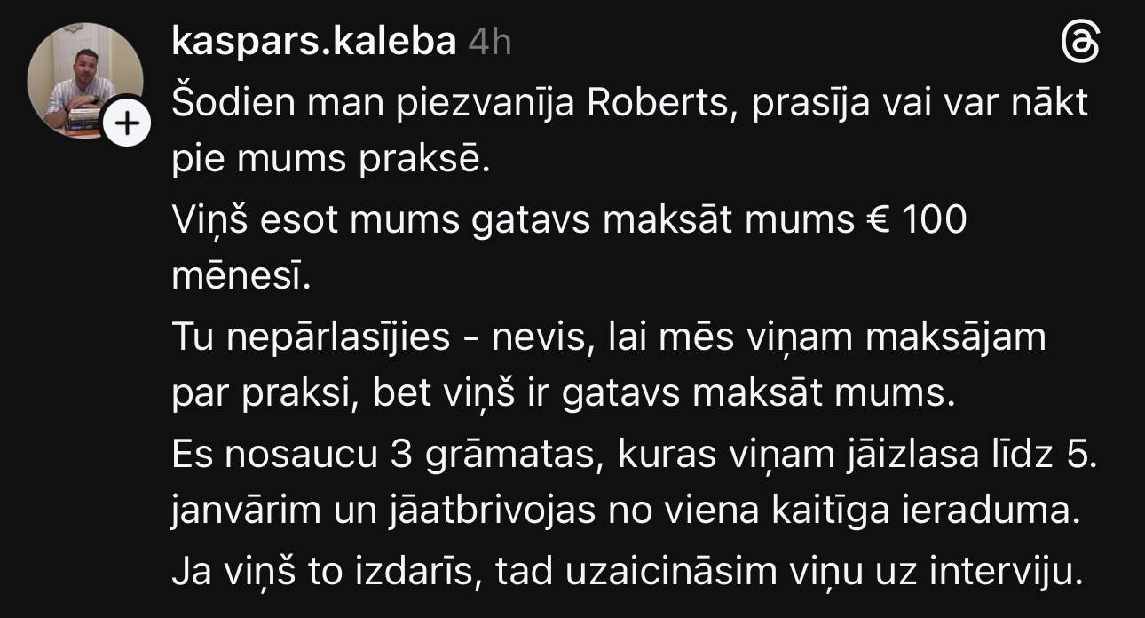 “Šodien man piezvanīja Roberts, prasīja, vai var nākt pie mums praksē. Viņš esot gatavs maksāt mums 100 eiro mēnesī. Tu nepārlasījies — nevis, lai mēs viņam maksājam par praksi, bet viņš ir gatavs maksāt mums. Es nosaucu trīs grāmatas, kuras viņam jāizlasa līdz 5. janvārim, un jāatbrīvojas no viena kaitīga ieraduma. Ja viņš to izdarīs, tad uzaicināsim viņu uz interviju,” vietnē “Threads” stāsta Kaleba.