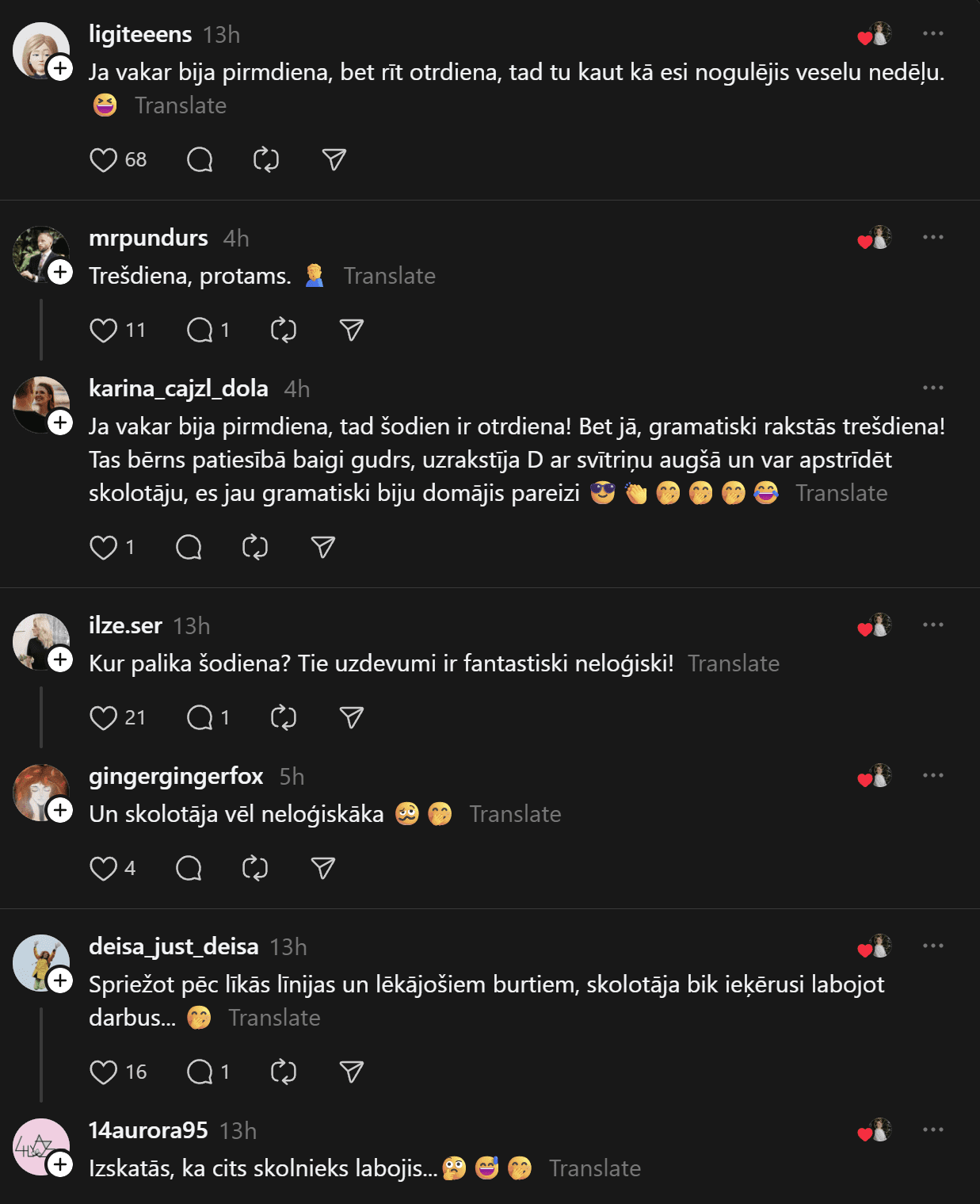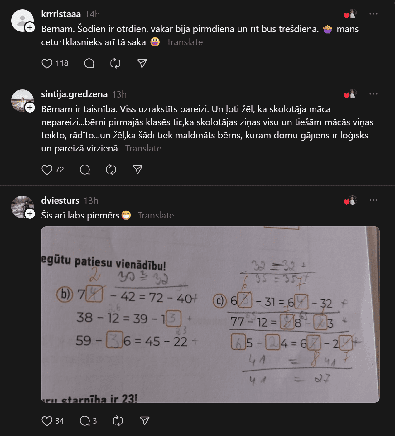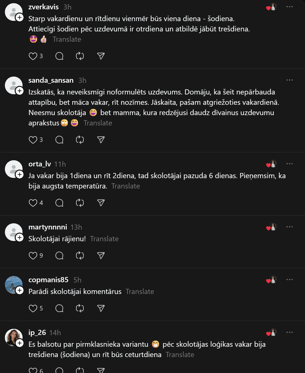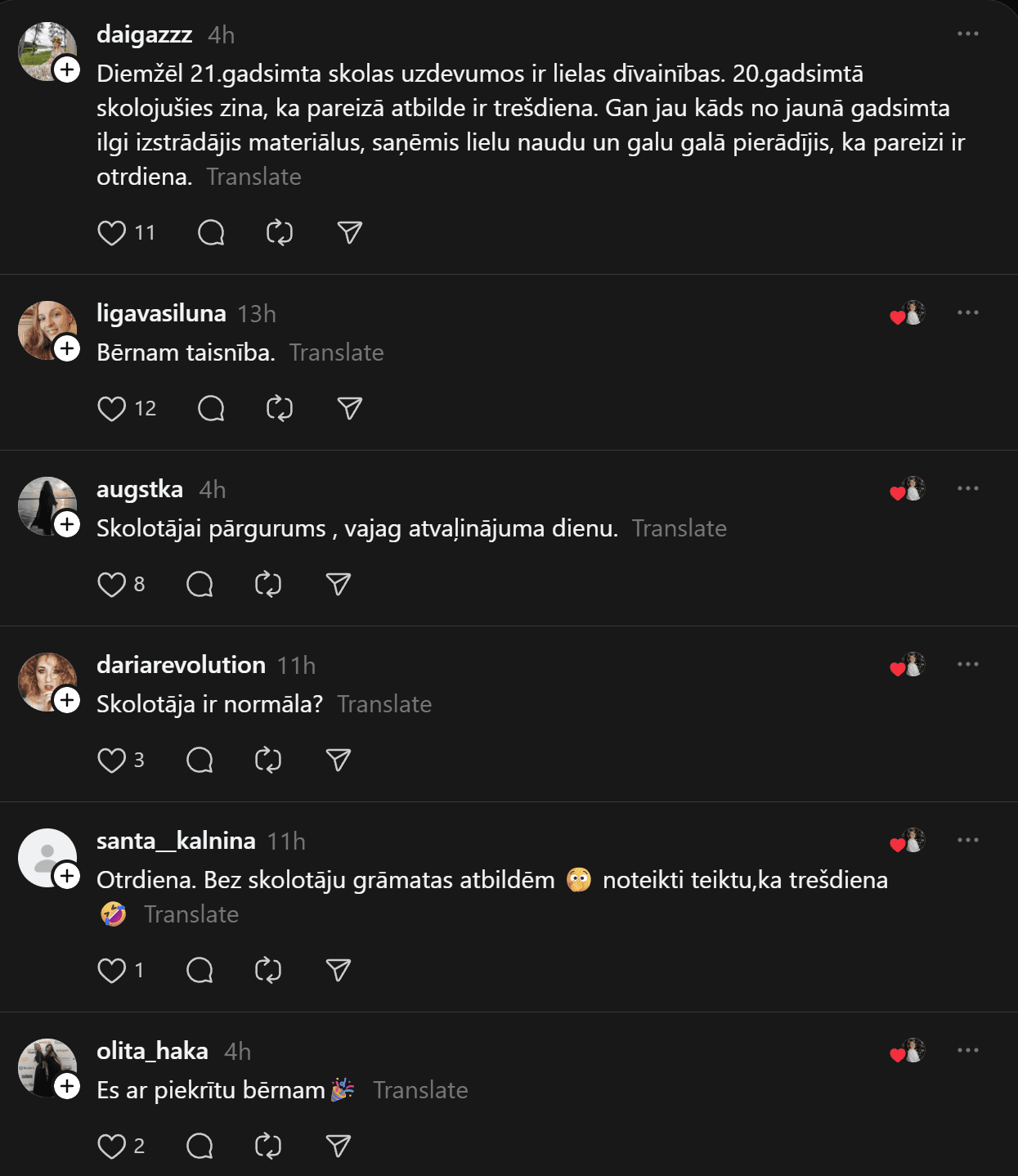 Savukārt @anheladol izsakās pavisam skarbi: “Man riebjas kaudzēm mājasdarbi, kurus gandrīz kā neiespējami izpildīt, ja tikai nemācīties līdz naktīm nepaēdot. Izglītības sistēma drausmīgā stāvoklī – skolotāju nav, tie, kas ir, sen jau izdeguši – nervozi un kliedzoši.