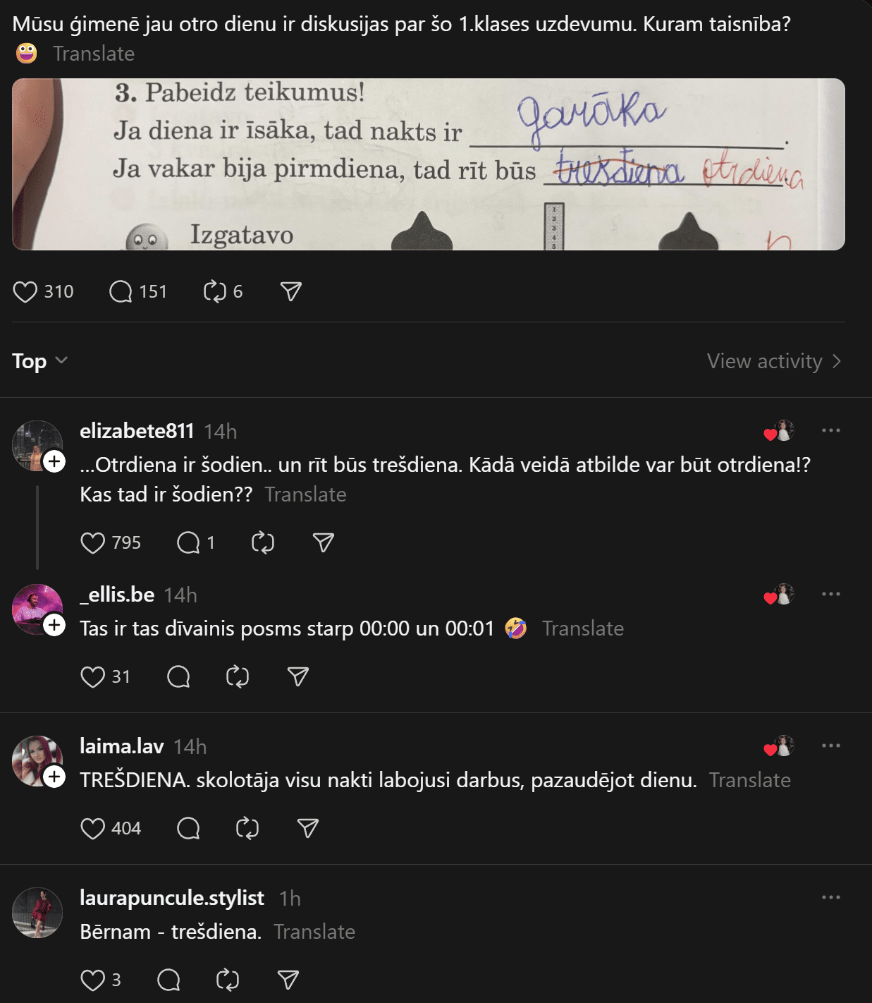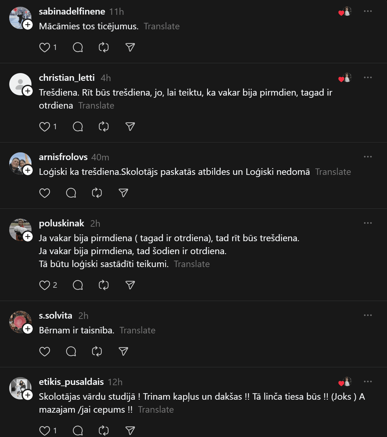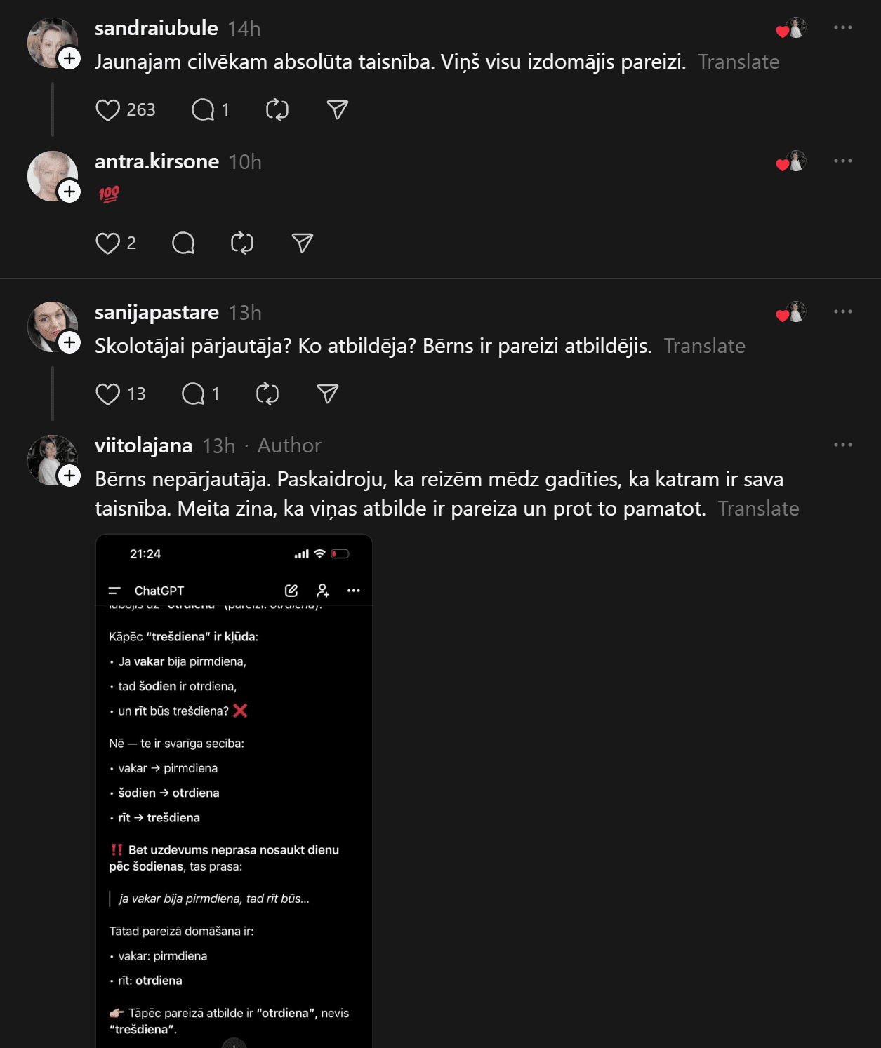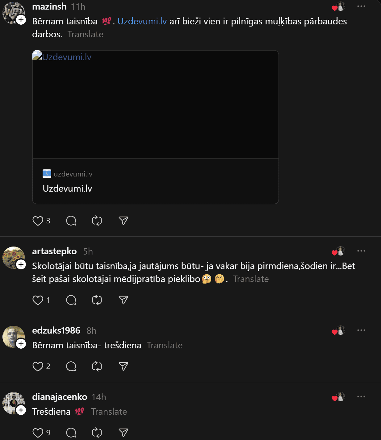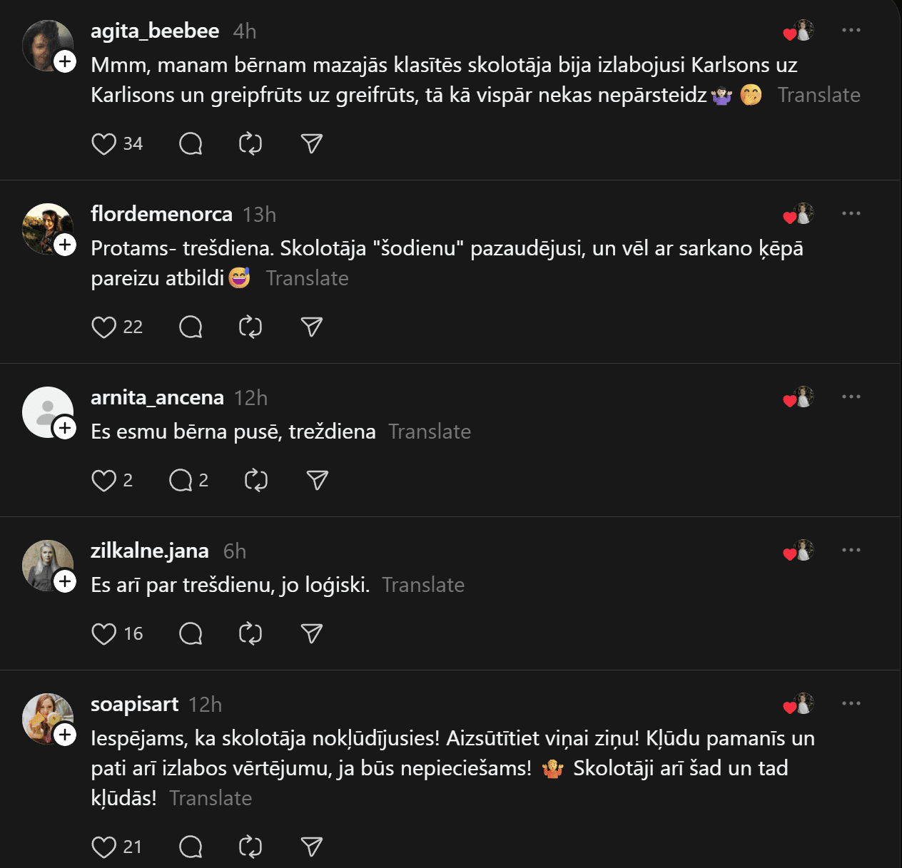 Savukārt @anheladol izsakās pavisam skarbi: “Man riebjas kaudzēm mājasdarbi, kurus gandrīz kā neiespējami izpildīt, ja tikai nemācīties līdz naktīm nepaēdot. Izglītības sistēma drausmīgā stāvoklī – skolotāju nav, tie, kas ir, sen jau izdeguši – nervozi un kliedzoši.