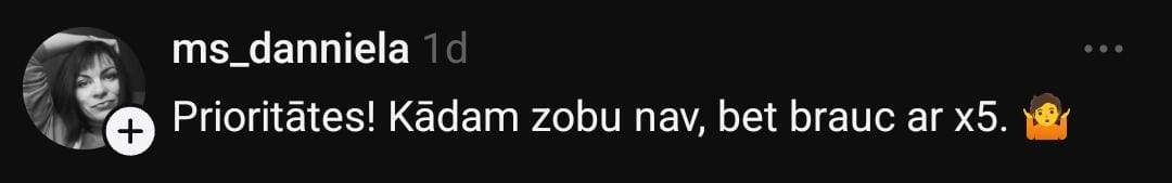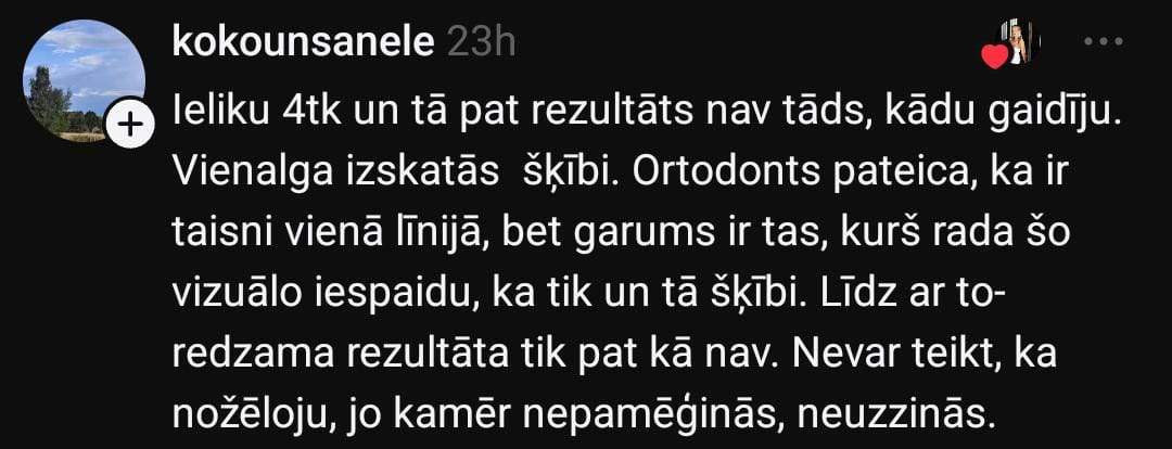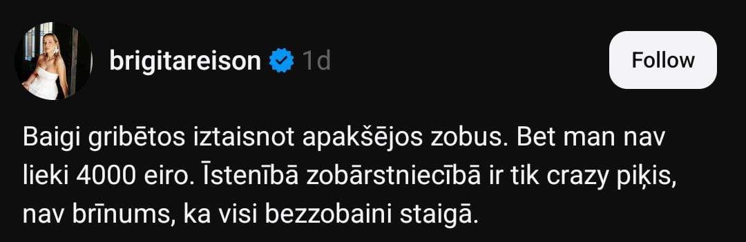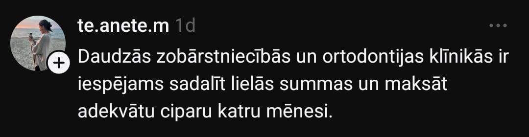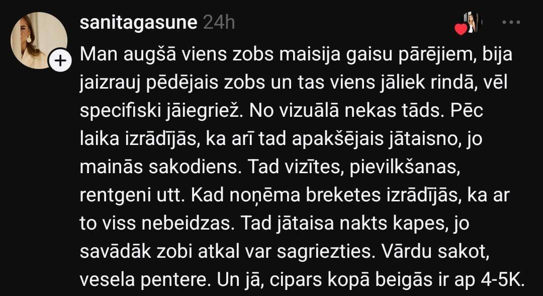 “Baigi gribētos iztaisnot apakšējos zobus. Bet man nav lieki 4000 eiro. Īstenībā zobārstniecībā ir tik “crazy” cenas – nav brīnums, ka visi bezzobaini staigā.”
