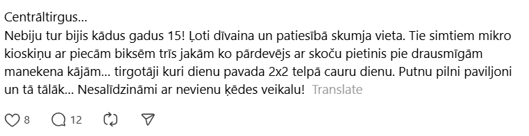 Rīgas Centrāltirgus, kas reiz bija pilsētas tirdzniecības sirds, daļai iedzīvotāju šobrīd rada nevis nostalģiju, bet gan vieglu šoku. Sociālo tīklu platformas “Threads” lietotāji dalījušies pieredzē.