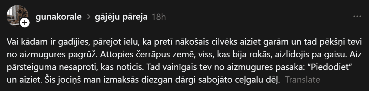 Lai arī internetā un medijos redzam daudz un dažādus labus piemērus, kad līdzcilvēki nav stāvējuši malā un ir palīdzējuši grūtībās nonākušajiem, ir arī reizes, kad tiek runāts par tieši pretējo. Vietnē “Threads” Guna dalījusies ar negatīvu, pat fizisku līdzcilvēku rīcību.