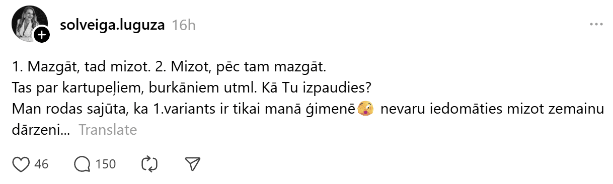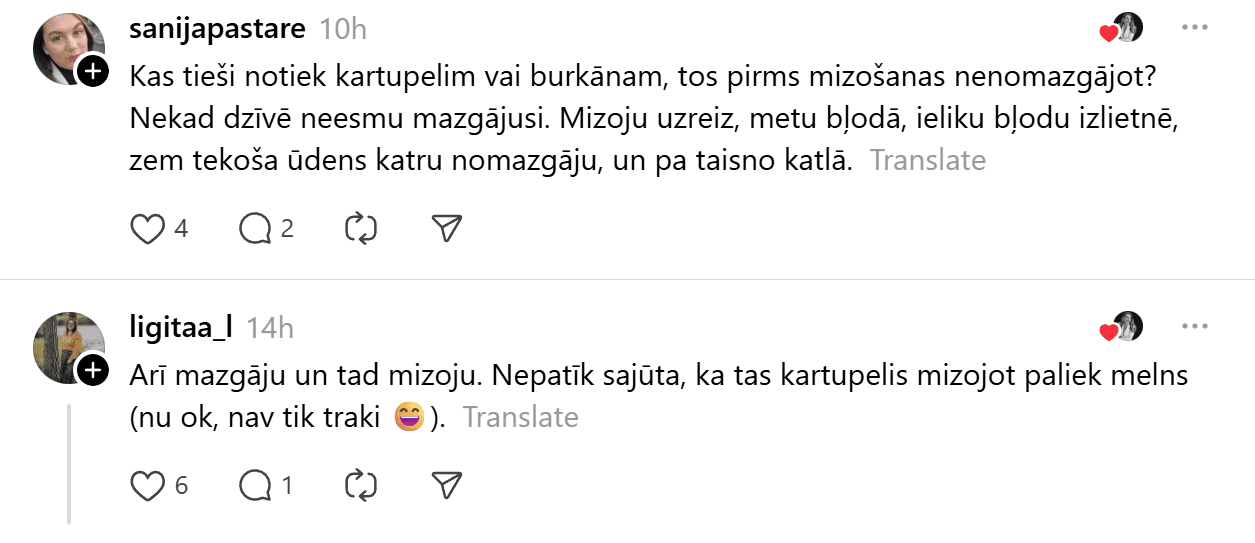 Sociālie tīkli nereti ir laba vieta, kur atrast sadzīviskus padomus un ieteikumus, kā ikdienā darīt lietas efektīvāk. Dažreiz vienkārši ir vēlme noskaidrot, kā pieņemts darīt citās mājās. Šoreiz stāsts par kādu diskusiju platformā “Threads”. Diskusijas temats patiesībā ir bieži debašu raisošs jautājums – vai kartupeļus, burkānus, bietes un citus dārzeņus vispirms vajadzētu nomazgāt un tikai tad mizot, vai tomēr labāk rīkoties otrādi?