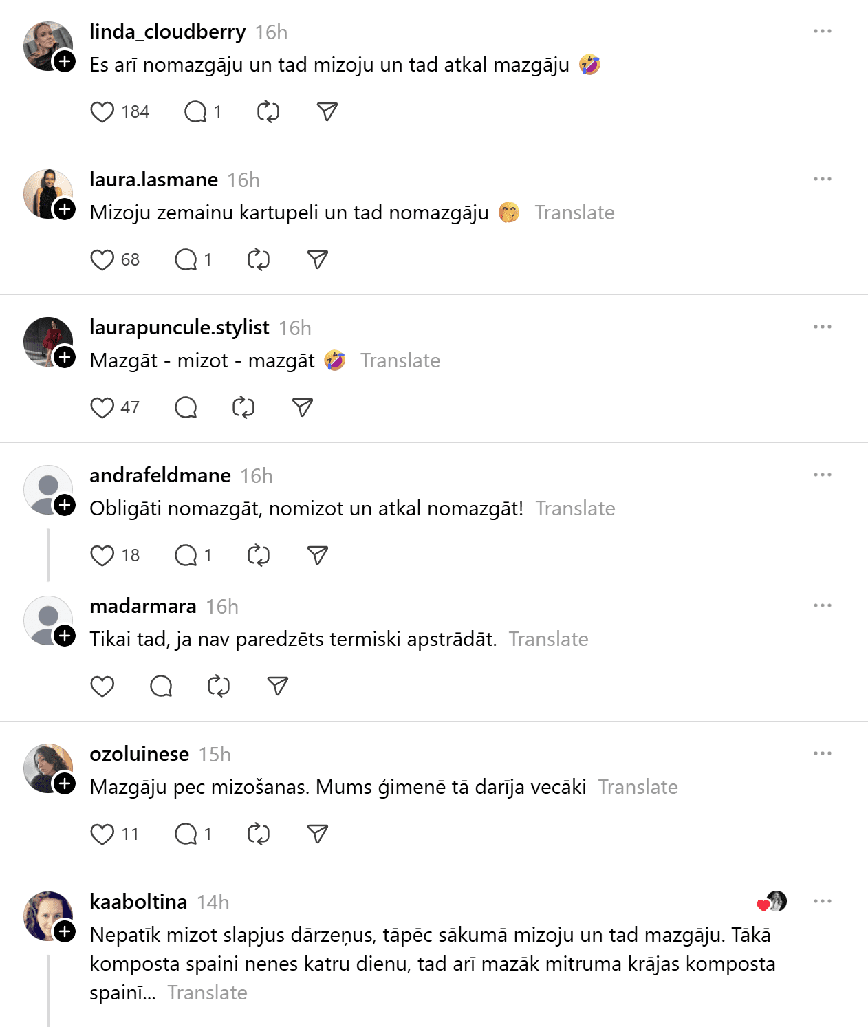 Vairums diskusijā iesaistīto norādīja, ka parasti vispirms nomazgā dārzeņus, pirms tos sāk mizot. Tomēr ir arī cilvēki, kuri neredz jēgu mazgāt, tad mizot, un tad atkal mazgāt.