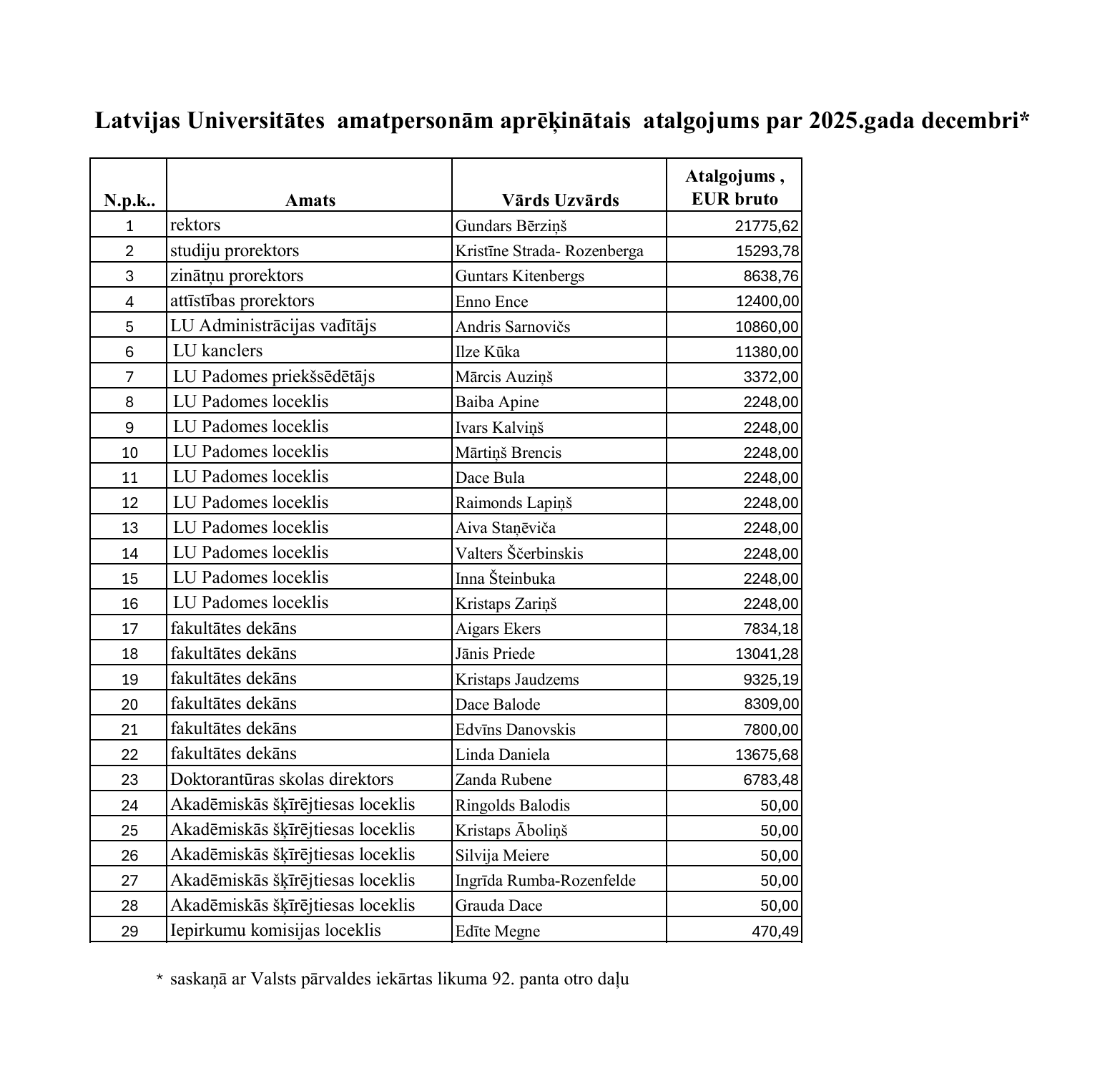 Kā redzams tabulā, LU rektoram Gundaram Bērziņam alga decembrī tik liela, cik daudzi mums gada laikā nenopelna – 21775,62 eiro. Bērziņš ir vienīgais ar algu virs 20 tūkstošiem eiro, taču arī citiem darbiniekiem, šķiet, nav par ko sūdzēties. Vēl sešas amatpersonas decembrī saņēmušas algu virs 10 tūkstošiem eiro. Un vēl sešas – virs 5 tūkstošiem eiro. Vismazāk saņēmuši Akadēmiskās šķīrējtiesas locekļi – 50 eiro.