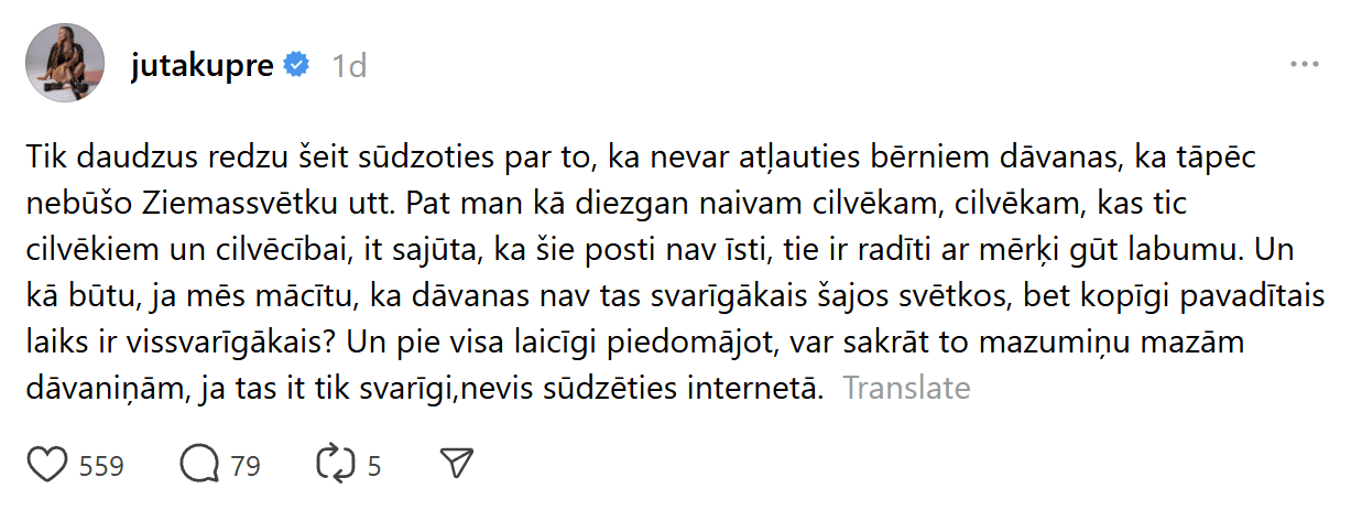 Un kā būtu, ja mēs mācītu, ka dāvanas nav tas svarīgākais šajos svētkos, bet kopīgi pavadītais laiks ir vissvarīgākais? Un pie visa laicīgi piedomājot, var sakrāt to mazumiņu mazām dāvaniņām, ja tas ir tik svarīgi, nevis sūdzēties internetā.”
